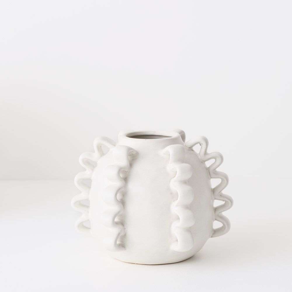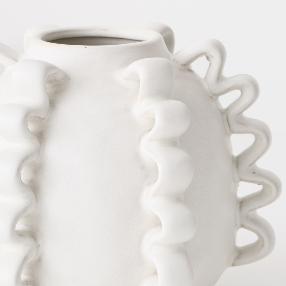 A stylish ceramic pot featuring ribbon-like details and a smooth white finish. Both decorative and functional, it’s perfect for adding a soft, sculptural touch to any space.