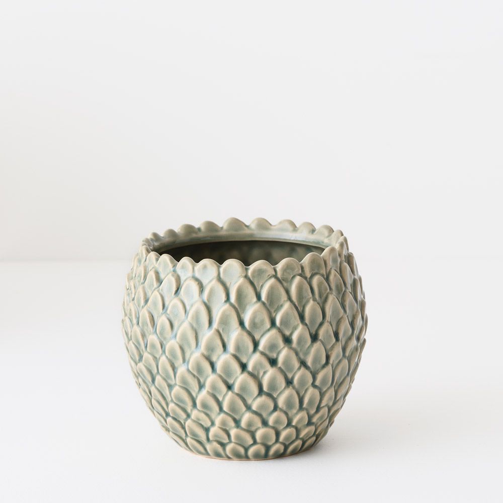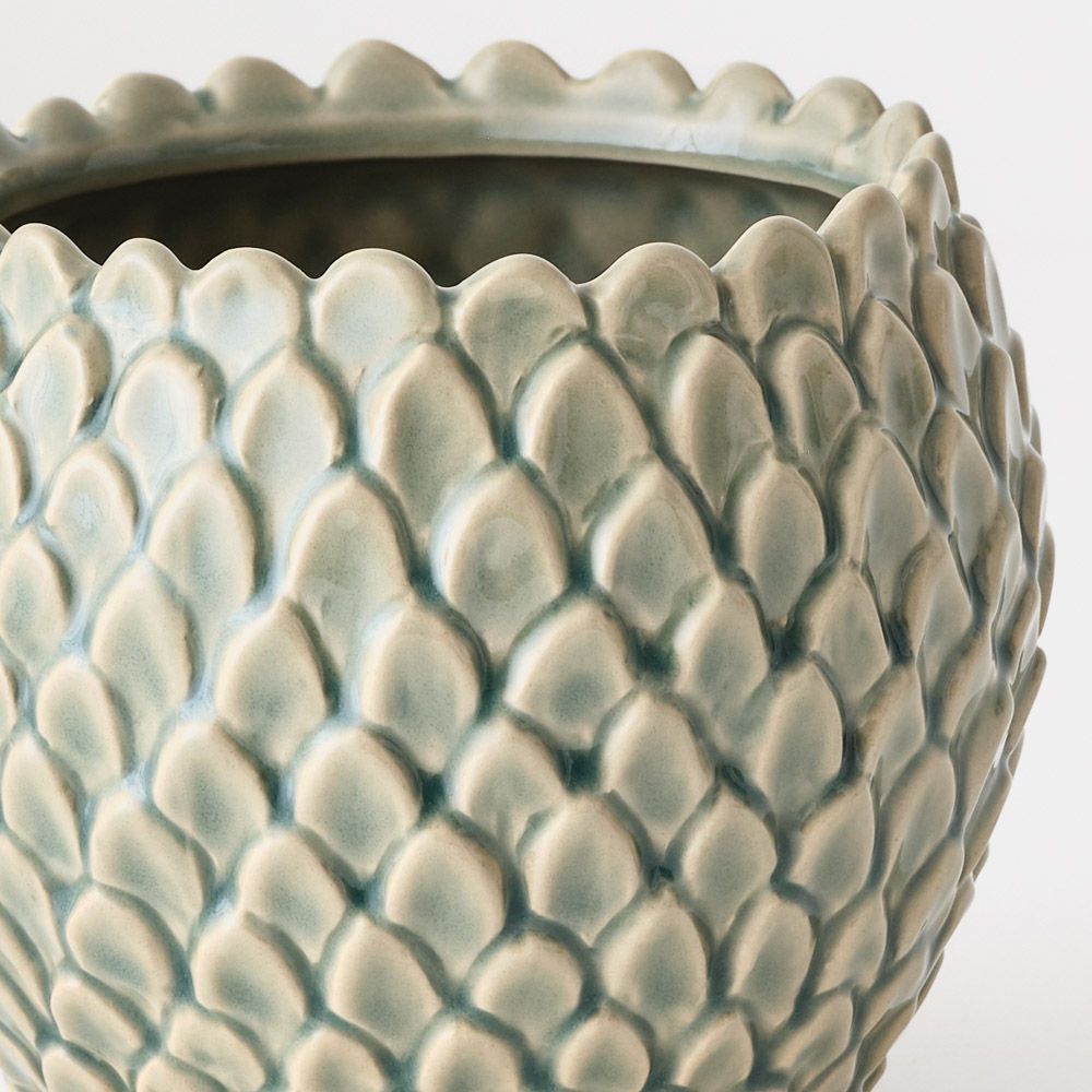 A ceramic pot featuring a scale-like detailed finish and a beautiful hand-glazed surface. Perfect for housing small plants and adding subtle texture to your space.