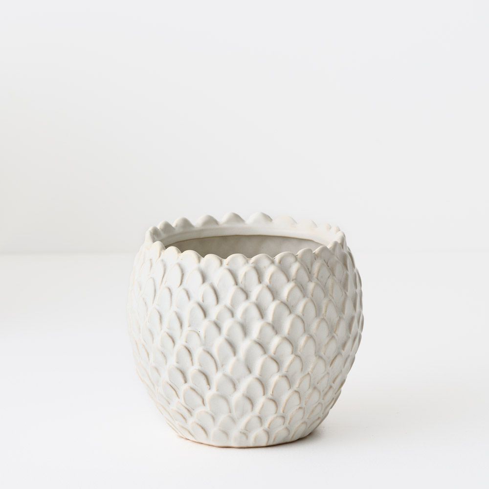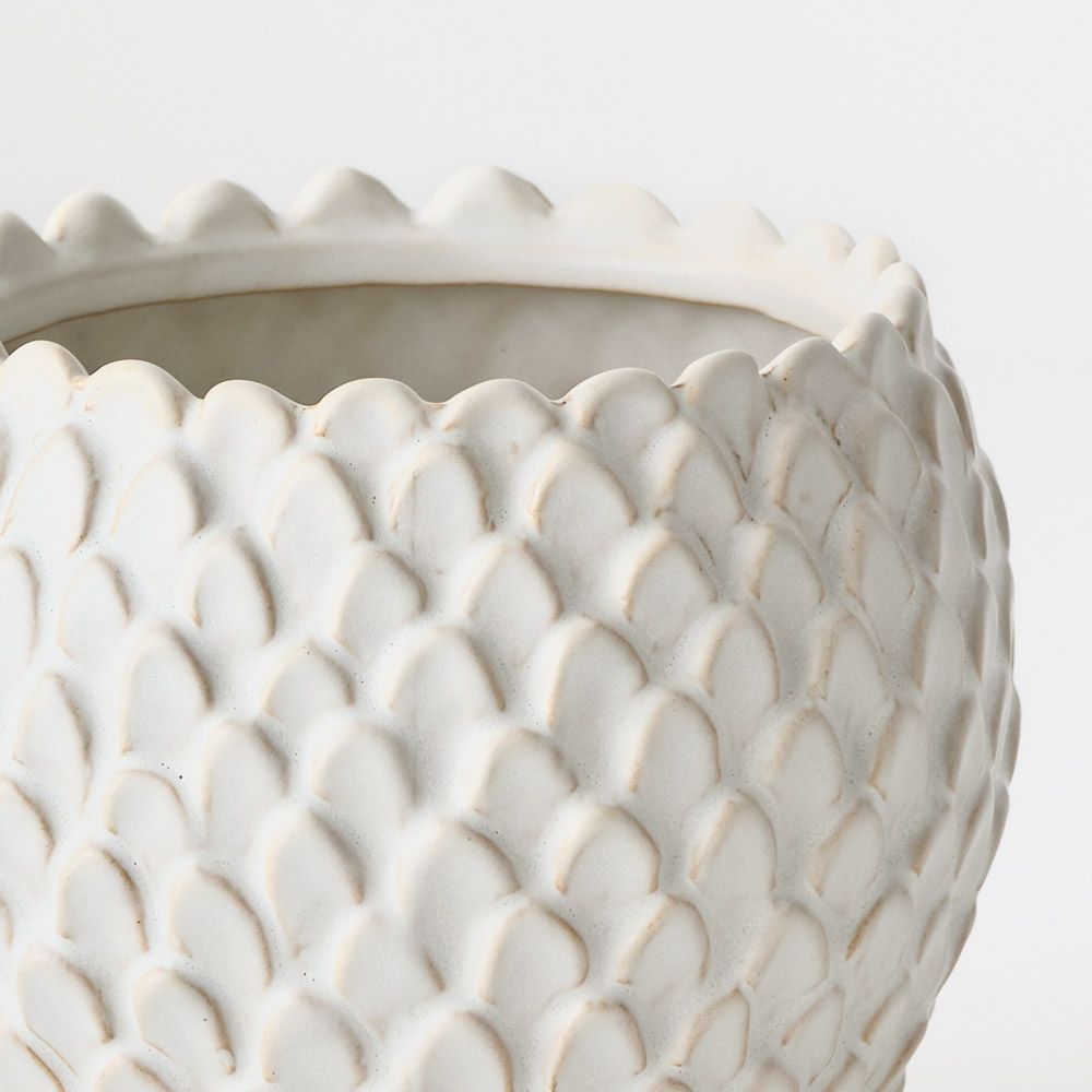 A ceramic pot featuring a scale-like detailed finish and a beautiful hand-glazed surface. Perfect for housing small plants and adding subtle texture to your space.