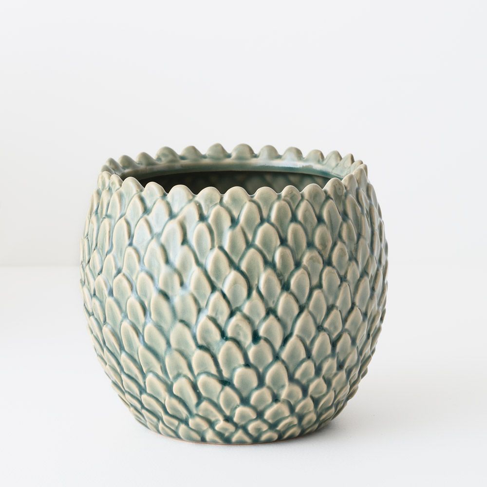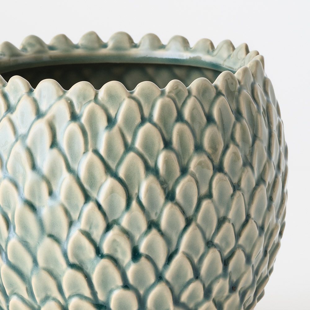 A ceramic pot featuring a scale-like detailed finish and a beautiful hand-glazed surface. Perfect for housing small plants and adding subtle texture to your space.