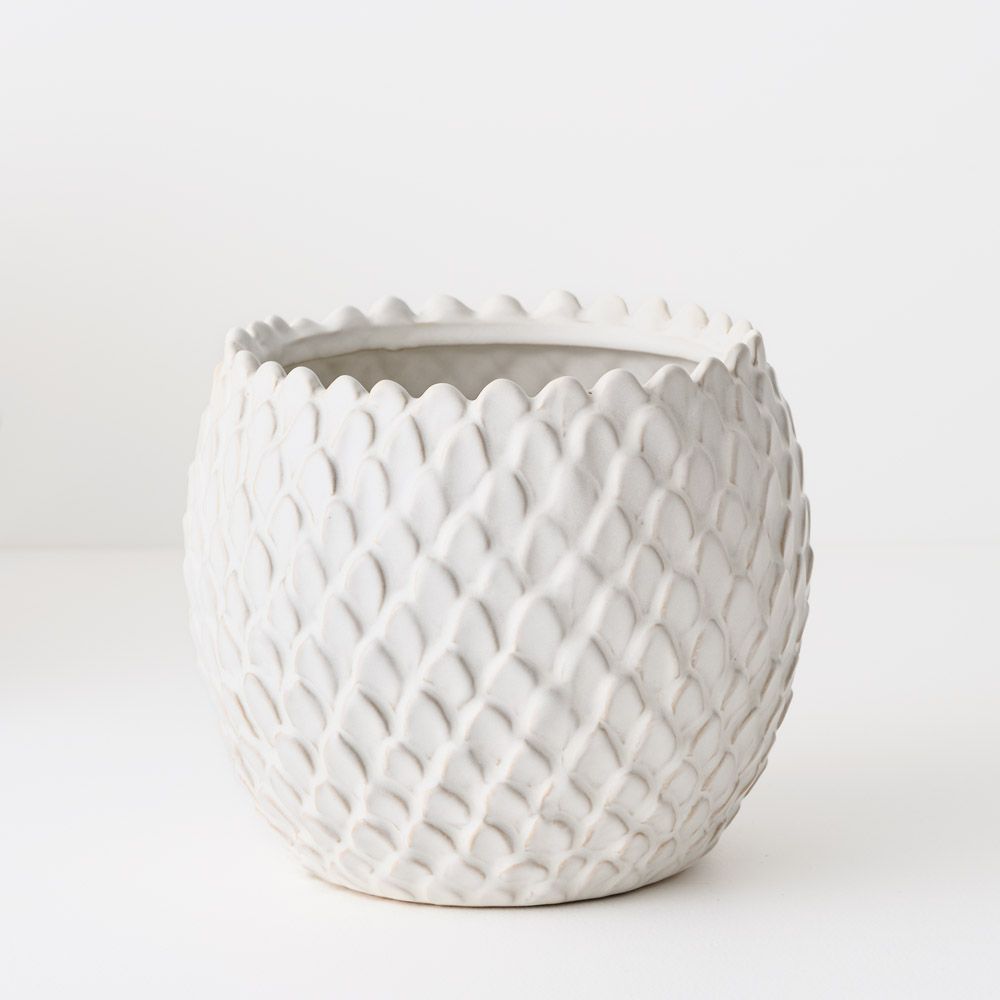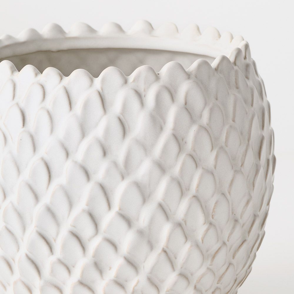 A ceramic pot featuring a scale-like detailed finish and a beautiful hand-glazed surface. Perfect for housing small plants and adding subtle texture to your space.