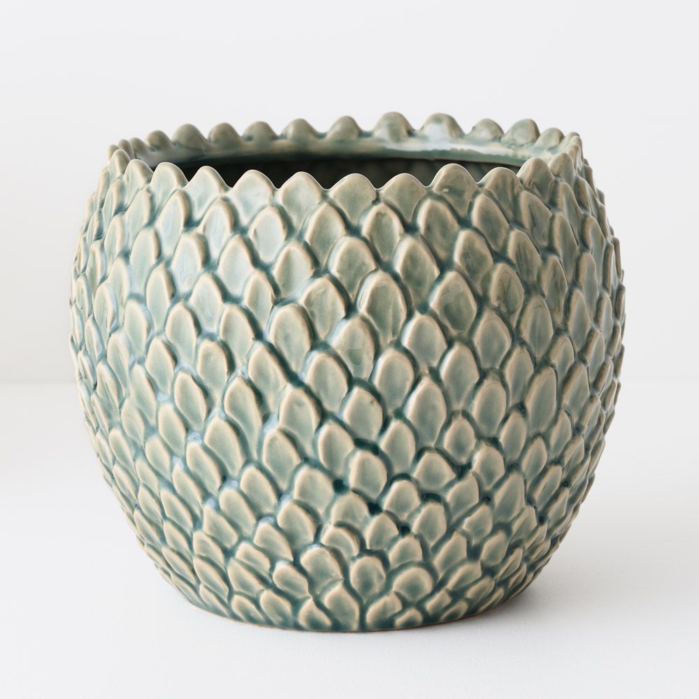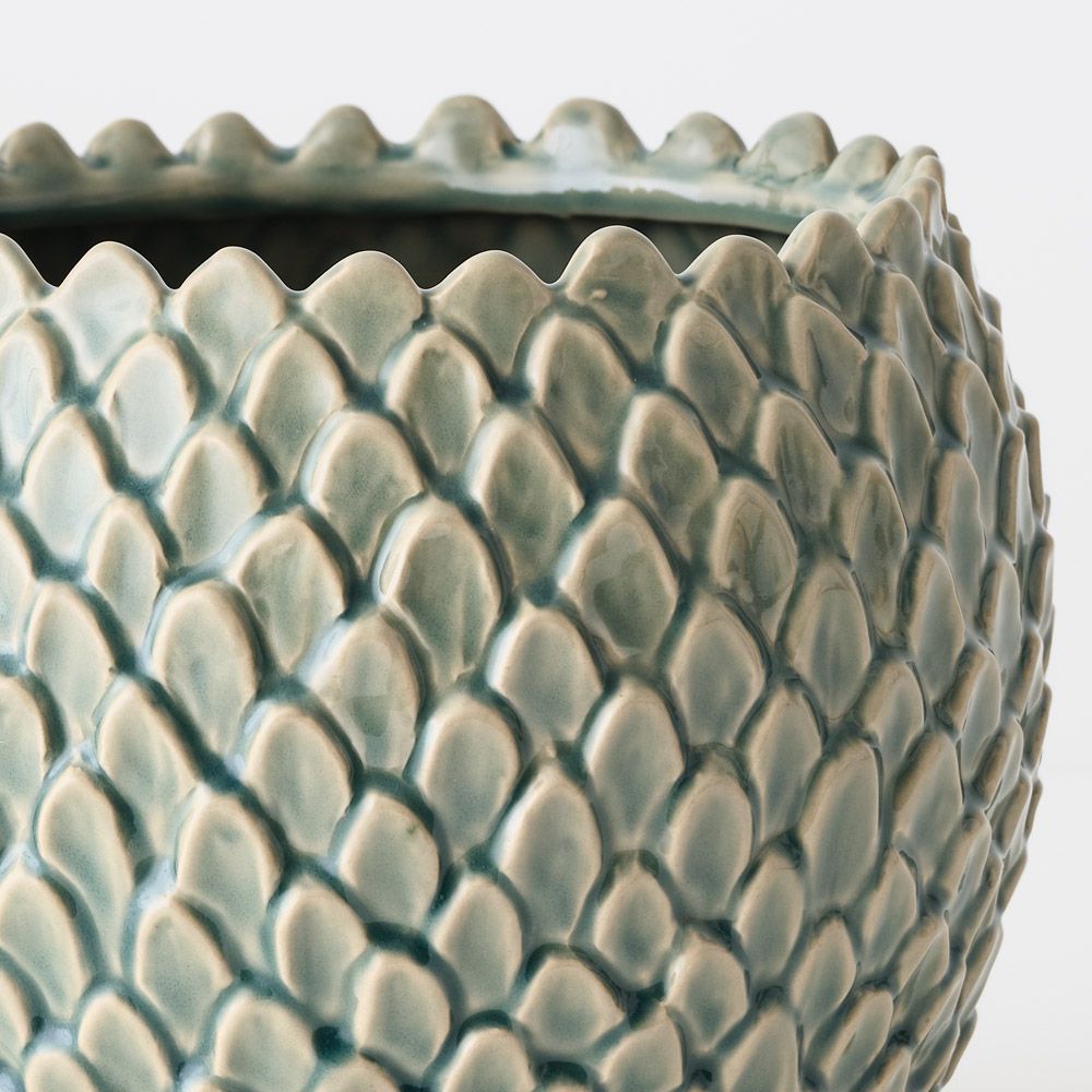 A ceramic pot featuring a scale-like detailed finish and a beautiful hand-glazed surface. Perfect for housing small plants and adding subtle texture to your space.