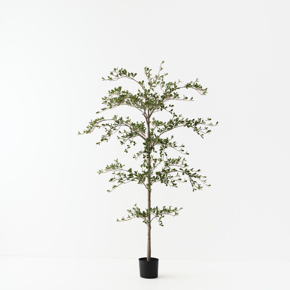 A striking, lifelike tree featuring dark olive leaves and natural texture, adding depth and character to any space.