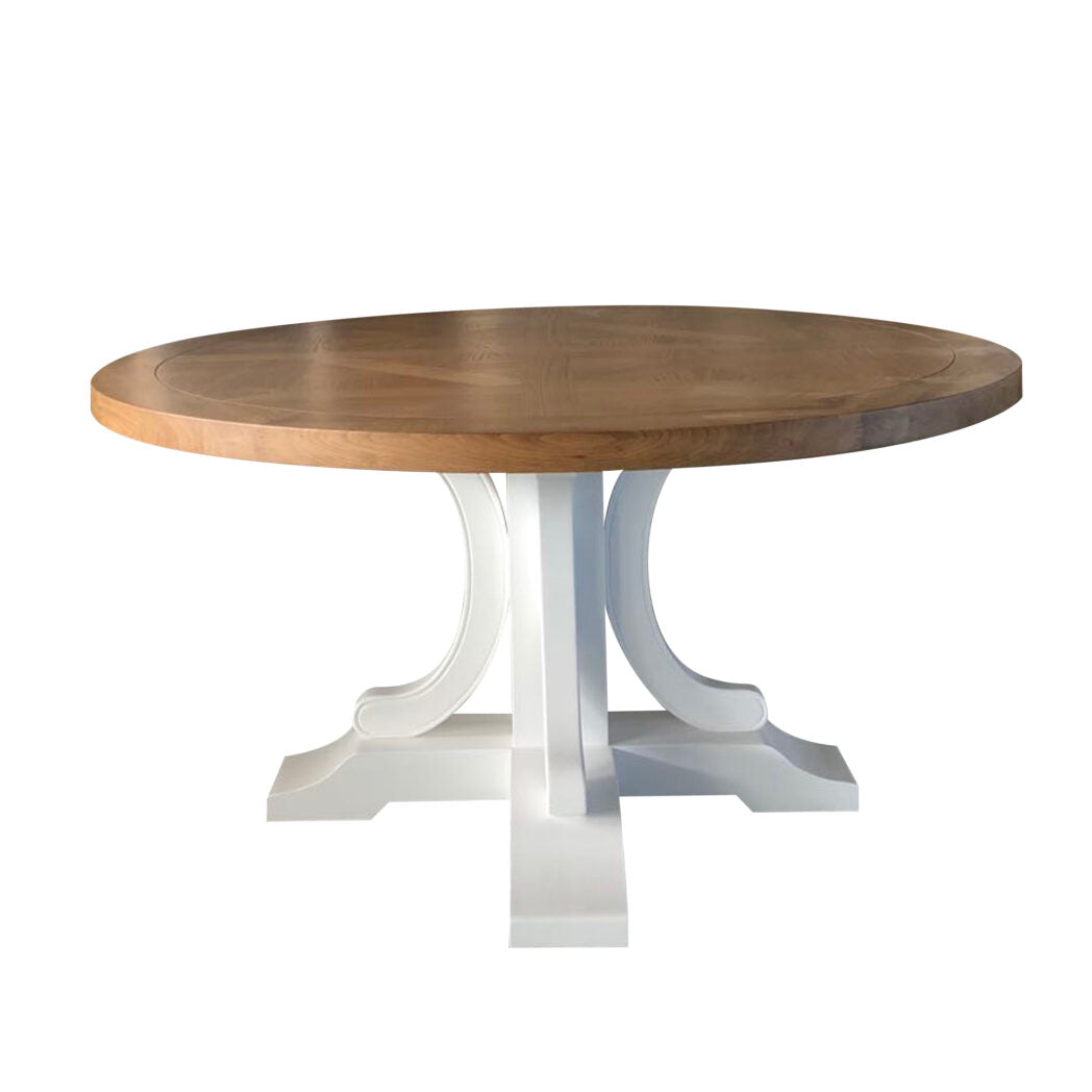 Solid oak parquetry top in natural finish, Satin white legs, Use coasters under beverages to prevent marks and stains