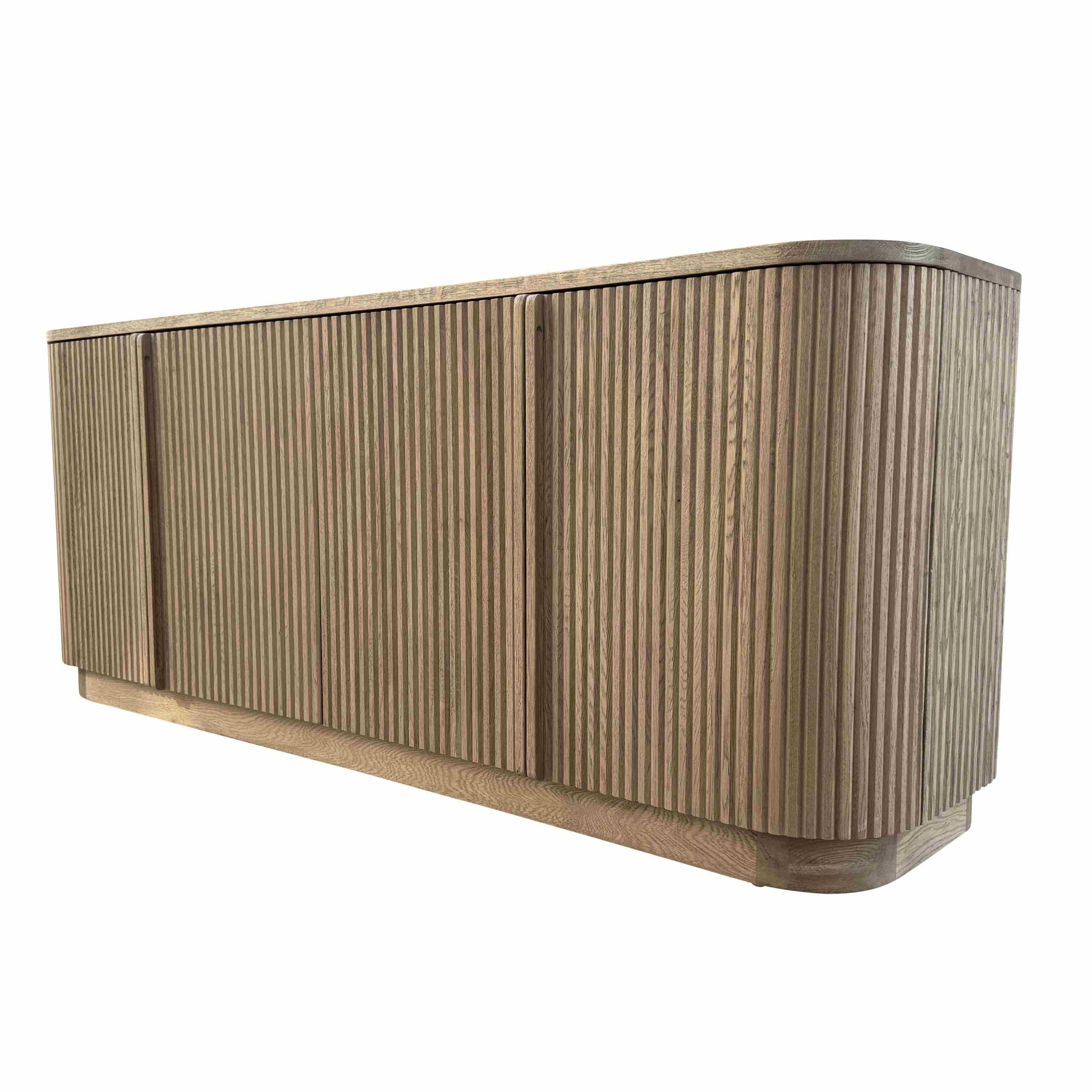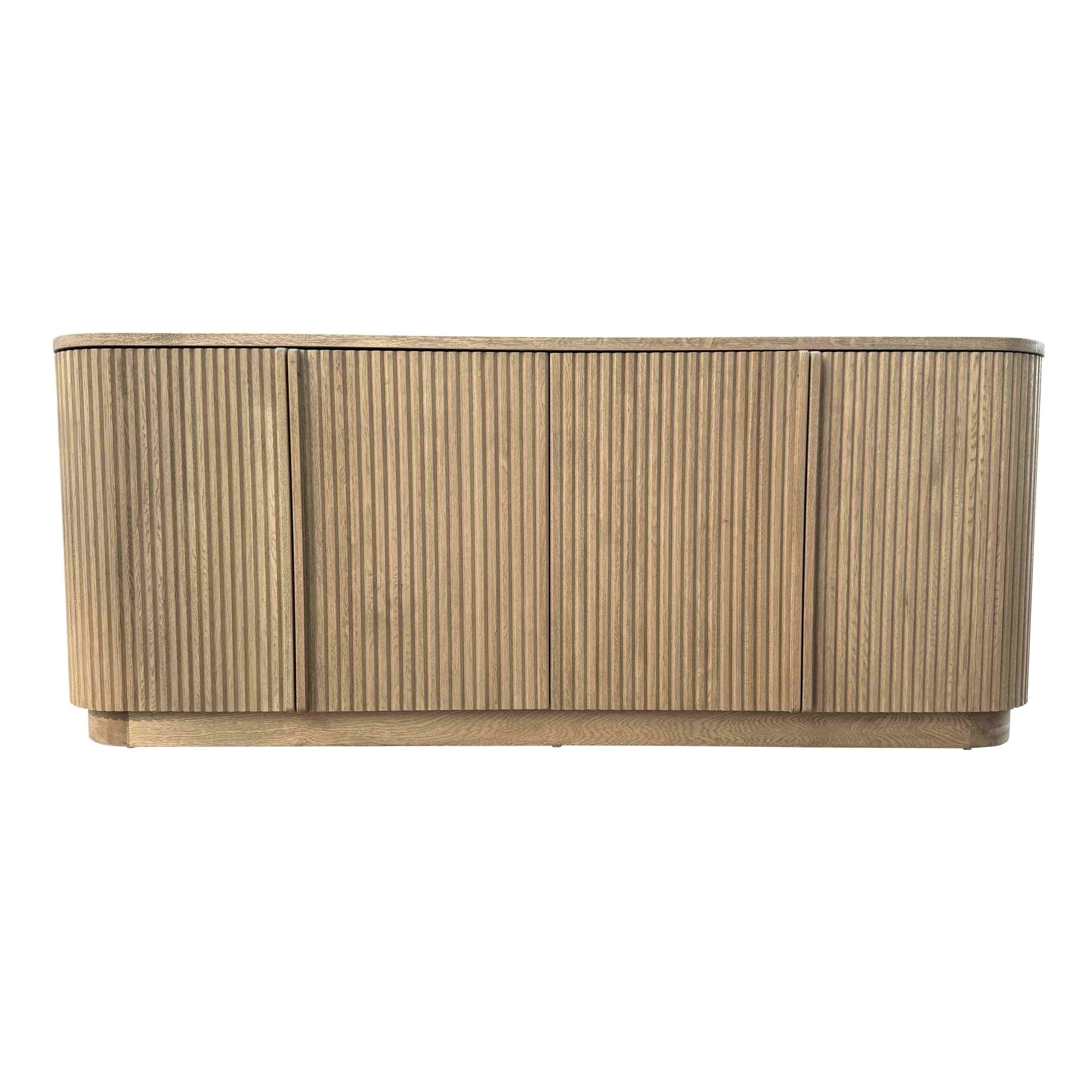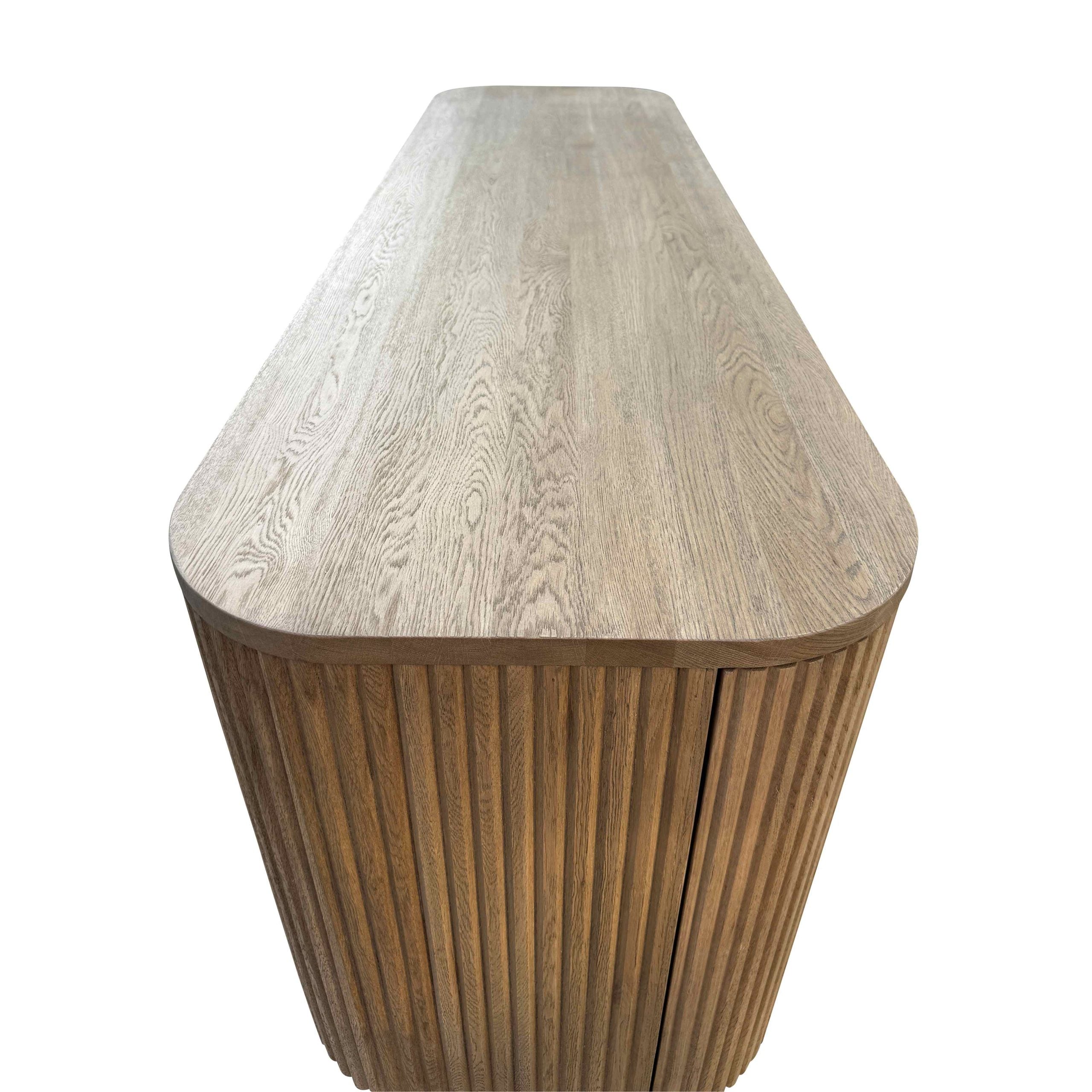 Solid oak timber and oak veneers, Vertical surfaces feature solid oak timber reeding, Integrated wood pulls, Weathered oak finish, Use coasters under beverages to prevent marks and stains, Size: 185cm x 53cm x 76cmH, SKU: HL635-105