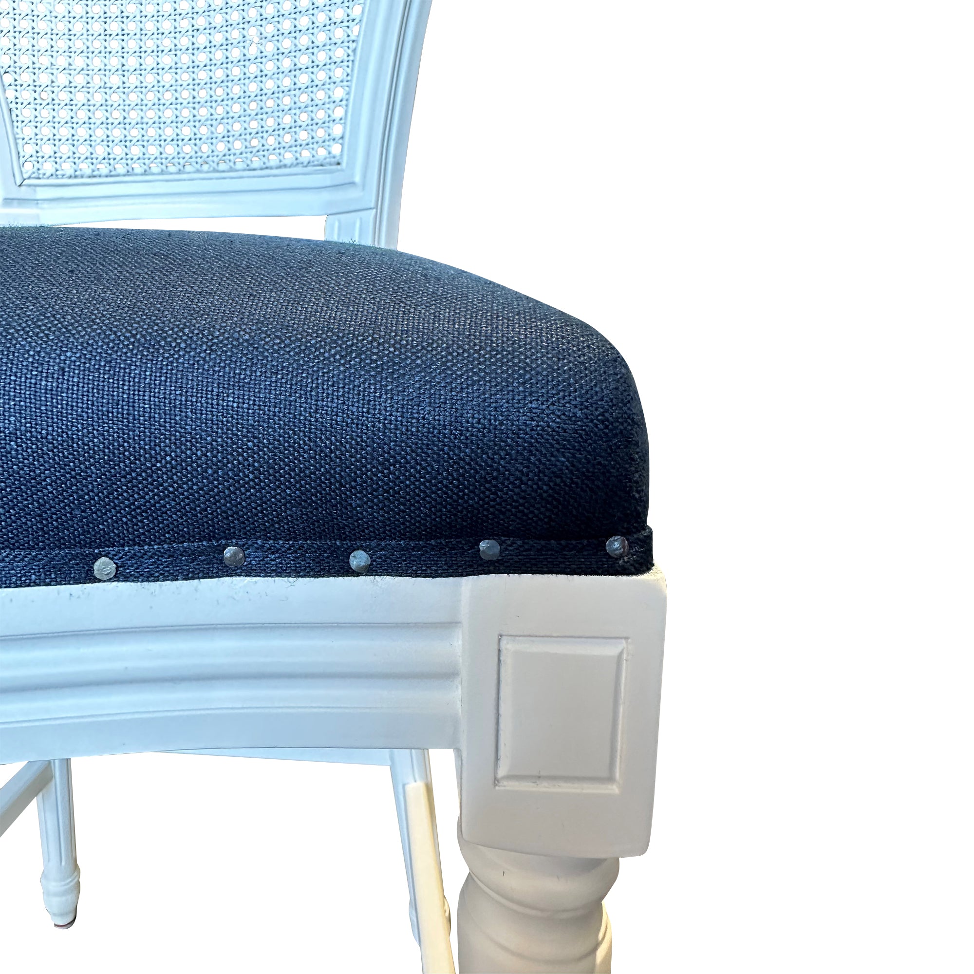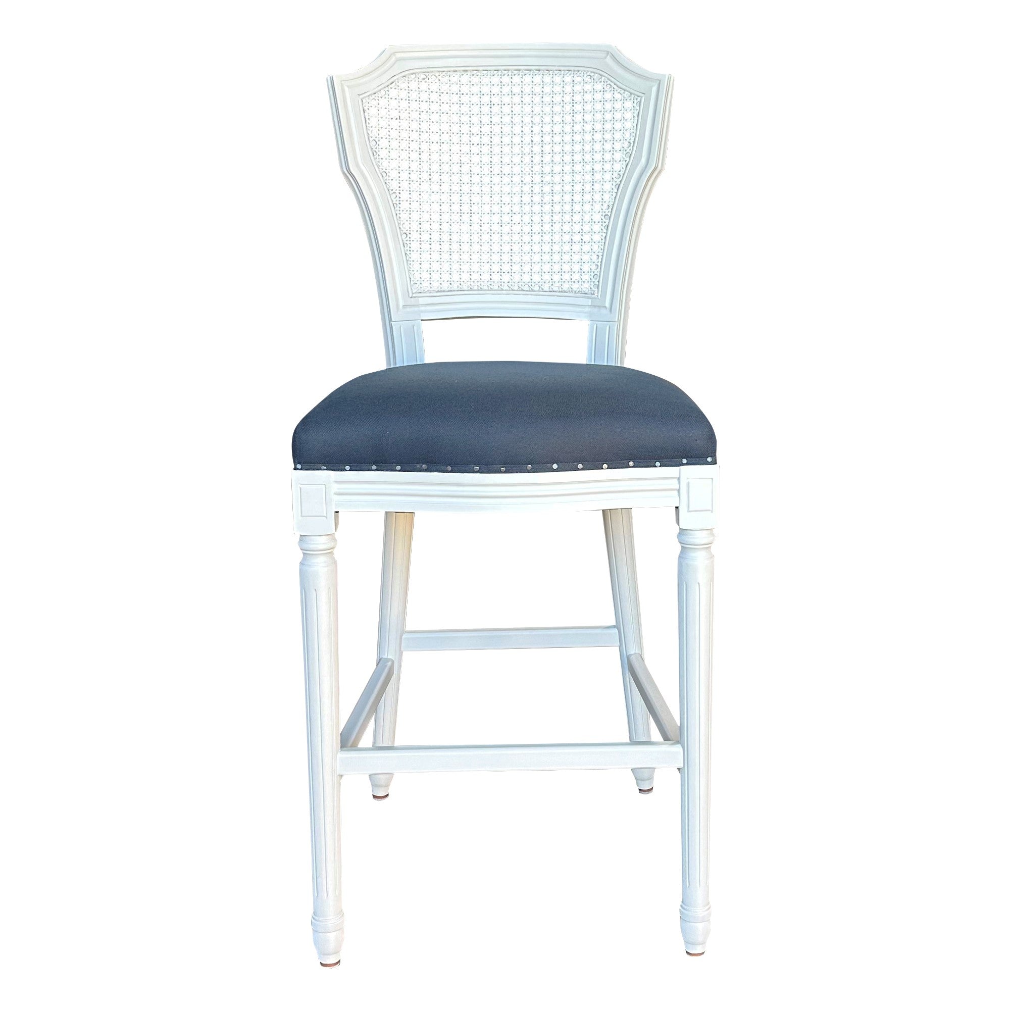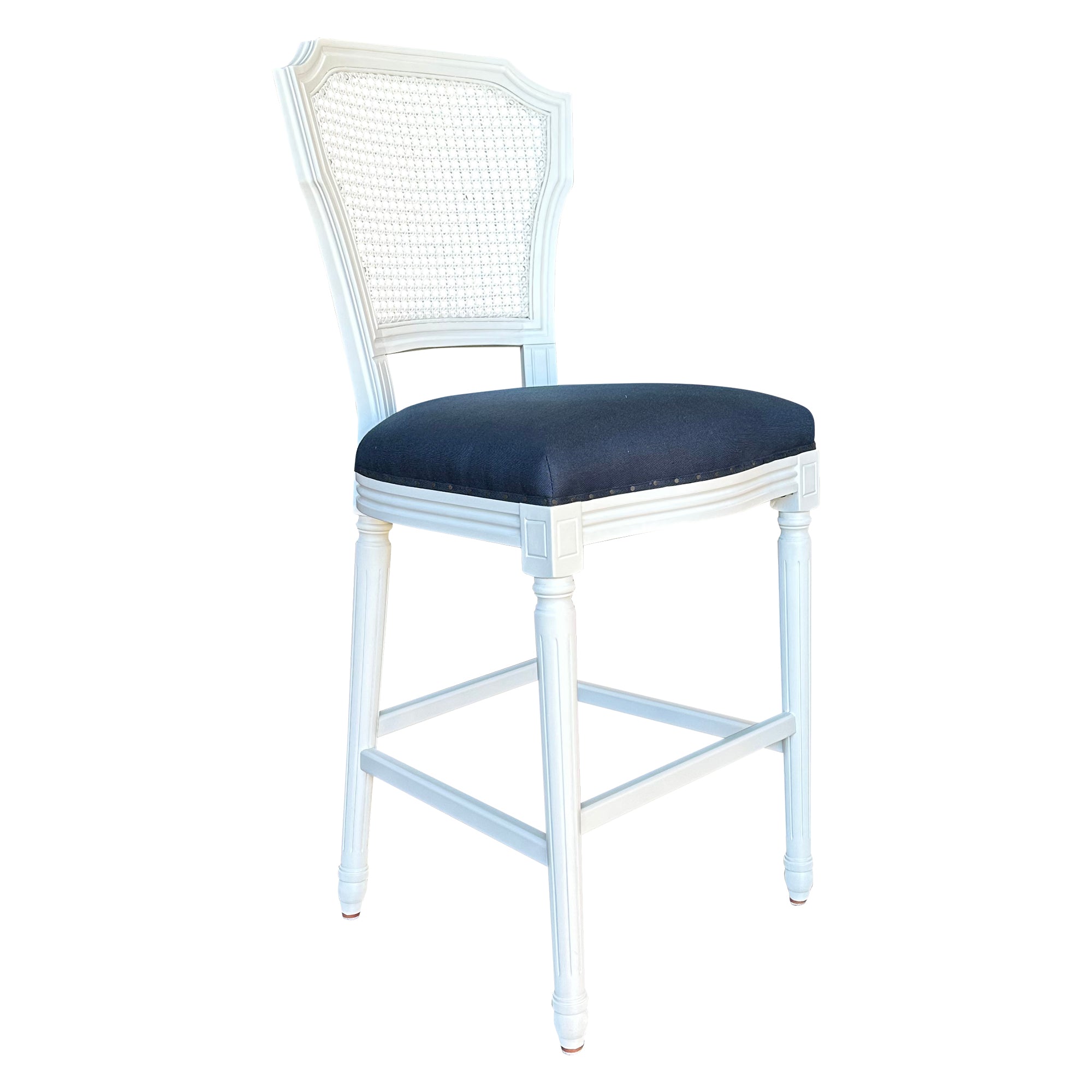 Introducing the Olivia White Barstool Navy Linen, a stylish and elegant addition to any home. Crafted with solid oak timber in a sleek white finish, this barstool exudes a timeless charm. The seat is upholstered in 100% navy linen, providing both comfort and durability. The back of the barstool features a beautiful rattan design, adding a touch of texture and sophistication. Measuring 47cm in width, 56cm in depth, and 108cm in height, this barstool is the perfect size for any bar or kitchen counter. Its SKU is P0038-3-MWF10 and its dimensions are 47 cm x 56 cm x 108 cm. Elevate your home decor with the Olivia White Barstool Navy Linen, available now at House of Isabella.