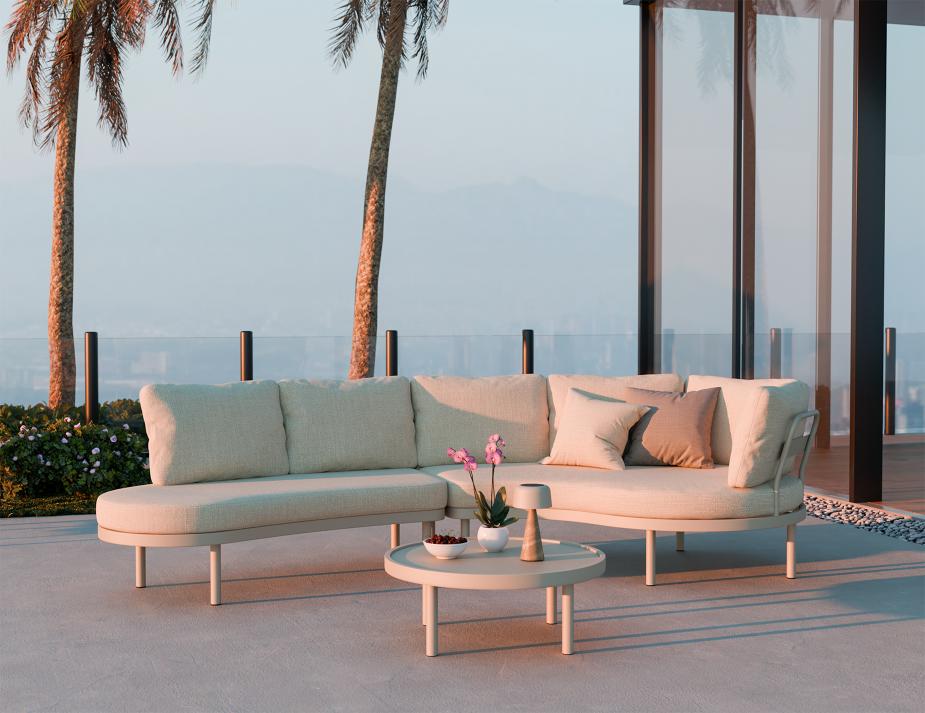 Aluna Sofa Left End Open - Latte: Curved Outdoor Sofa The Aluna Sofa Left End Open - Latte combines sculptural form with commercial-grade durability. Designed for professional outdoor applications, its softened curved silhouette is paired with a refined Latte frame and tactile Oat Bouclé cushions, delivering both visual comfort and performance for high-traffic outdoor zones. Refined aluminium frame and weather-resistant bouclé upholstery The powder-coated aluminium frame in Latte evokes handcrafted ceramics and filtered architectural light, while the Oat Bouclé cushions introduce tactile warmth and comfort. Engineered by Bent Design Studio, this modular configuration supports flexible layout planning with an open left end. Weather covers are included, and Olefin-backed upholstery ensures UV resistance and outdoor longevity. Softened design language for versatile outdoor applications Spanning 316cm in width, this layout suits rooftop breakouts, hospitality lounges and landscaped terraces. Lightweight yet robust, the Aluna Sofa Left End Open is ready for specification, with stock availability and short lead times for commercial, hospitality and residential projects alike.