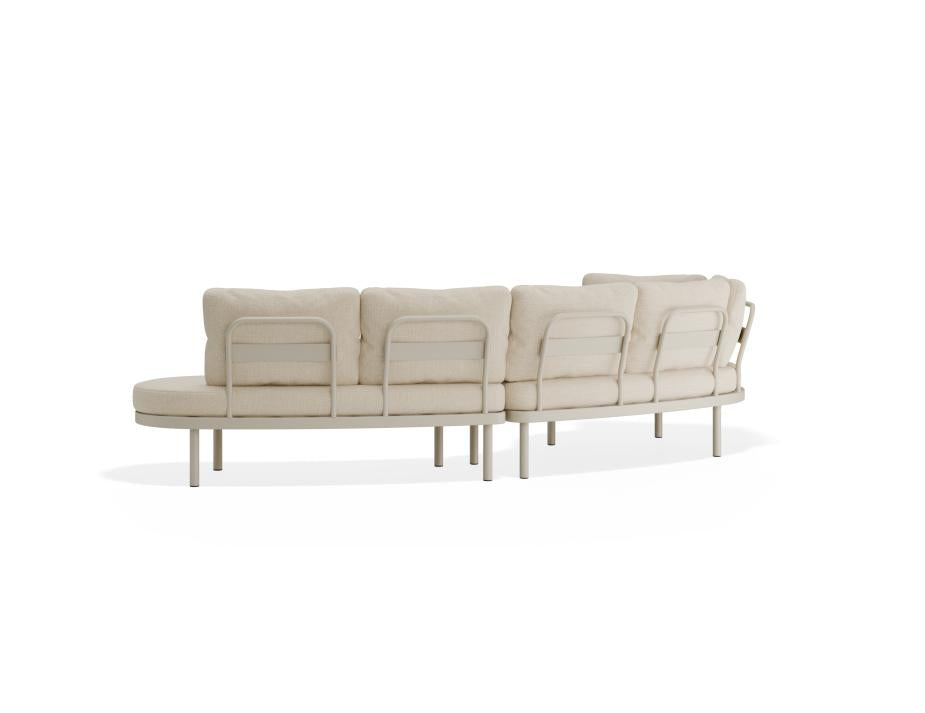 Aluna Sofa Right End Open - Latte: Curved Outdoor Sofa The Aluna Sofa Right End Open - Latte offers a clean and calming seating solution for outdoor projects where modularity and material integrity are key. The Latte frame colour delivers a contemporary yet grounded palette, enhanced by soft, textured Oat Bouclé cushions for an inviting finish. Architectural softness with fit-for-purpose durability Designed by Bent Design Studio, this configuration features a powder-coated aluminium frame in Latte—durable, corrosion-resistant and easy to maintain. The right-end open format provides flexibility for asymmetrical layouts or pairing with complementary units. Cushions are made with outdoor-grade Oat Bouclé fabric over Olefin backing, delivering comfort without compromising on weather protection. Built for design-led commercial outdoor environments Measuring 316cm wide, this sculptural curved format supports modular planning across commercial terraces, boutique hotel rooftops and multi-residential developments. Durable and aesthetically resolved, the Aluna Right End Open sofa delivers project-ready performance with refined, timeless appeal.