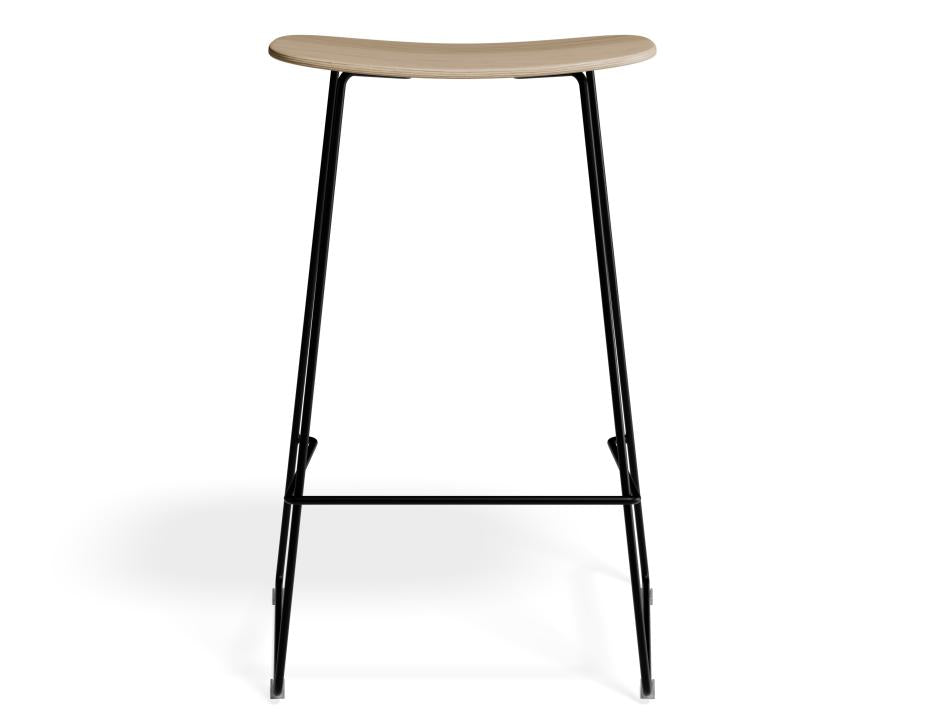 Elva Stool - Natural Seat - Black Frame with Warm Timber Detail The Elva Stool - Natural Seat - Black Frame delivers a clean, contemporary profile with a touch of warmth. Designed by Javan Fan for Level, this stool brings a natural timber element to modern commercial and residential interiors. Featuring a gently contoured American ash seat in its natural finish and a slim black powder-coated steel frame, the Elva is available in both 66cm counter height and 76cm bar height to suit a range of fit-outs. Crafted Timber Finish Meets Robust Black Steel Frame The standout feature of this version of the Elva Stool is its natural American ash seat light in tone, smooth to the touch, and rich in visible grain. The organic character of the wood offers a subtle contrast to the stool's refined 12mm steel frame, finished in matte black powder coat for strength and stability. Its clear glides help protect floors in commercial and high-traffic environments, supporting long-term performance. Flexible and Functional for Workplace and Residential Fit-outs With its natural timber appeal and resilient construction, the Elva Stool suits everything from workplace breakout spaces to contemporary kitchens and cafe counters. Its compact footprint and choice of two heights make it ideal for projects requiring both form and function. The precise joinery, minimalist form and exposed timber edge elevate its aesthetic while offering practical comfort for daily use.