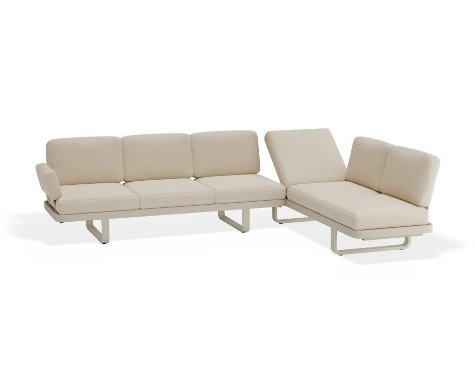 Delmar Config E Outdoor Sofa in Latte with Husk Cushions The Delmar Config E Outdoor Sofa pairs compact L-shaped seating with a bench-style platform, providing built-in functionality within a minimal footprint. The powder-coated latte frame introduces a contemporary softness that works well across both residential balconies and commercial alfresco spaces. The husk-toned cushions soften the visual impression, making the entire configuration suitable for hospitality lounges, shared gardens or multi-res developments that favour calm, cohesive palettes. The bench can serve as a casual seat, footrest, or a low-profile table—offering flexibility to suit dynamic user needs. Weather-tough materials with aesthetic consistency Engineered to perform outdoors, Config E's cushions are made with fast-drying foam and fade-resistant fabric covers to withstand sun and rain exposure. The aluminium frame resists rust and supports structural longevity in humid and coastal climates. Its clean design language and neutral tones allow it to sit comfortably across various surfaces and landscaping schemes. The bench platform uses composite slats with a natural timber appearance and minimal upkeep, making the unit both beautiful and highly functional.