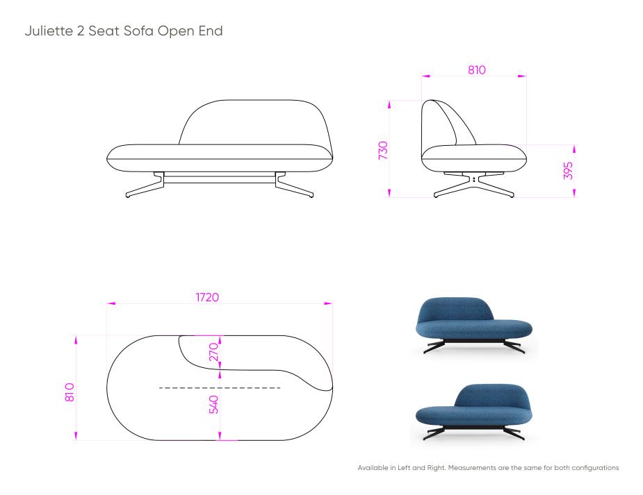 Juliette Sofa with Chaise - A Two-Seater Sofa for Contemporary Interiors The Juliette 2-Seater Sofa chaise is a sophisticated modular seating solution for modern commercial spaces. With its asymmetrical sculptural form, premium fabric upholstery, and modular adaptability, this sofa is perfect for architects, interior designers, and trade professionals. Whether in boutique hotels, executive offices, or high-end hospitality venues, it brings a contemporary yet inviting feel to professional interiors. Versatile Design for Open-Plan Lounges, Executive Offices, and Reception Areas Ideal for dynamic seating arrangements, the Juliette 2-Seater Sofa works as a standalone piece or part of a larger modular setup. Available in a variety of high-performance fabric colors, the Juliette 2-Seater Sofa lets you choose the perfect match for your space. Designed to withstand high-traffic environments, it combines durability and luxury, with a soft texture that enhances any professional setting. The full range includes additional configurations, giving you the flexibility to create the perfect seating arrangement. A Reinforced Modular Sofa with a Powder-Coated Metal Frame The Juliette 2-Seater Sofa features a sturdy internal frame with a powder-coated metal base. The sleek, slim metal legs provide stability while offering a modern, refined aesthetic, built for commercial-grade durability.