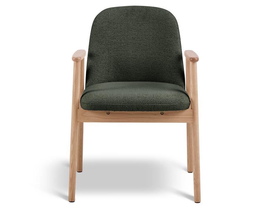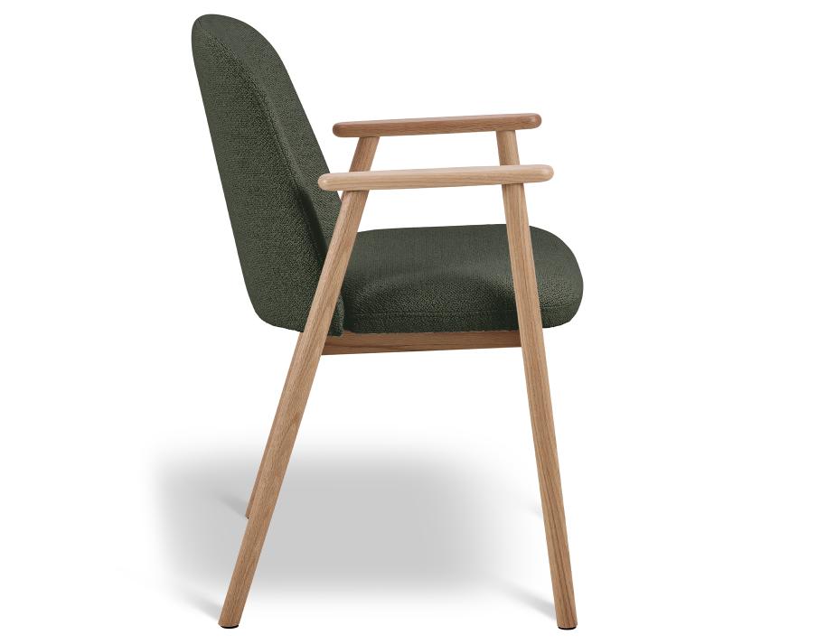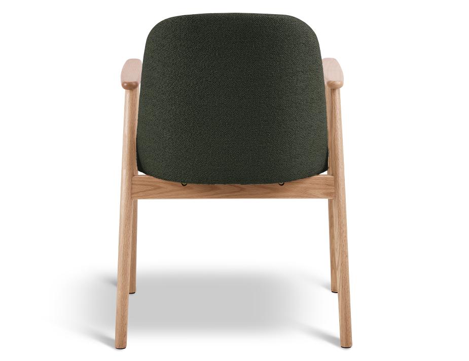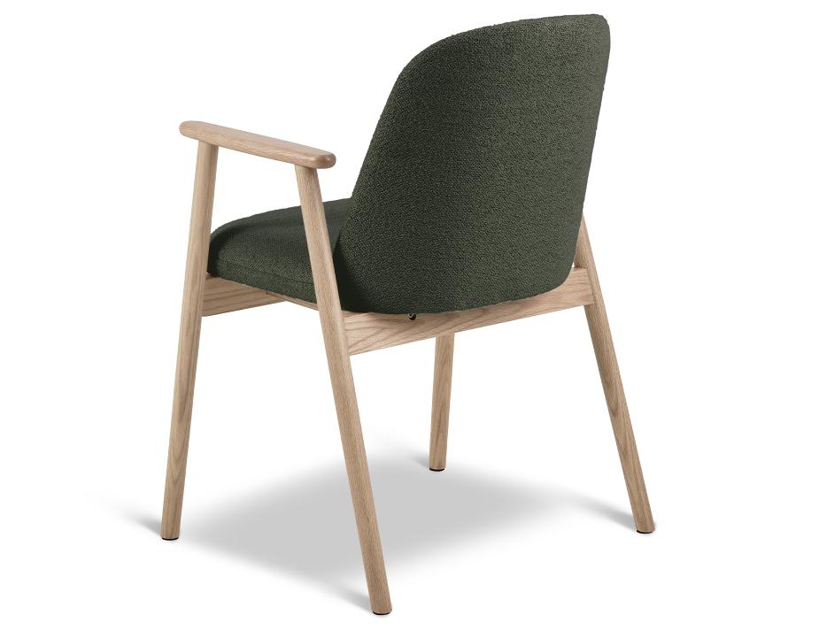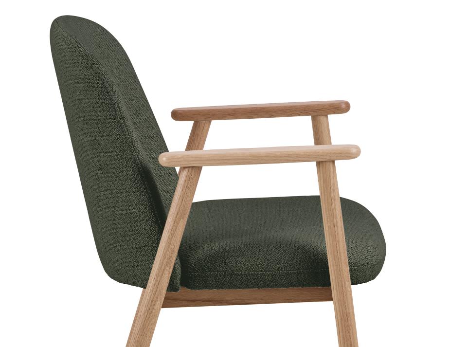 Solid Oak Upholstered Armchair - Lina in Natural and Hunter Green The Lina Armhair pairs solid oak construction with a distinctive curved backrest design, upholstered in a deep hunter green fabric. Built for comfort and visual appeal, this piece transitions effortlessly between dining spaces, meeting areas, and hospitality settings, offering both style and durability for professional and home environments. Solid Oak Build with Distinctive Curved Backrest Crafted with a natural solid oak frame and legs, the Lina Armhair offers stability and lasting performance. The curved backrest is designed for ergonomic support and visual interest, upholstered in a textured hunter green fabric that complements the clean timber profile. This balance of form and function enhances any interior with understated sophistication. Versatile Seating for Multiple Interior Applications From dining rooms to breakout spaces, and from cafés to client meeting areas, the Lina Arm chair adapts with ease. Its compact footprint suits high-density layouts, while its warm oak and deep green tones integrate seamlessly into both contemporary and traditional schemes. Designed for everyday use, it combines lasting comfort with a refined, adaptable aesthetic.