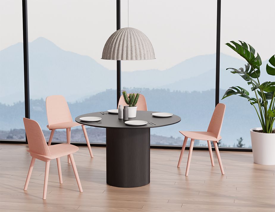 The Mimi Dining Table is the perfect addition to any restaurant, hotel, or commercial space. With its sleek black color, this black dining table can comfortably seat up to 5 guests with a diameter of 1200mm. The table boasts a sturdy base with a diameter of 550mm and a height of 750mm, providing stability for your guests. The top is 25mm thick and is made from black stained ash veneer or MDF, making it both durable and stylish. The overhang of 325mm provides ample space for guests to sit comfortably and enjoy their meal. This Mimi round Dining Table is sure to become the centerpiece of any dining area, providing a modern and sophisticated look. The black color is versatile and easy to match with any decor style. The table is perfect for those looking for a round dining table that is both functional and stylish. Its design is ideal for commercial spaces such as restaurants, hotels, and offices. The Mimi Dining Table is a must-have for any project manager, interior designer, or furniture outfitters company looking to create a dining area with a modern edge.