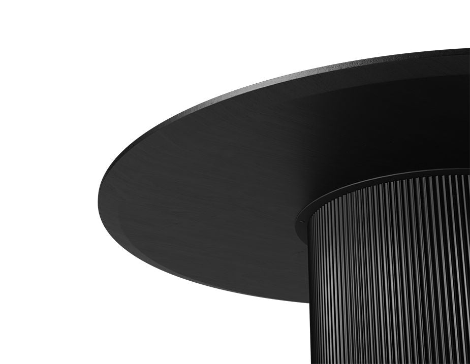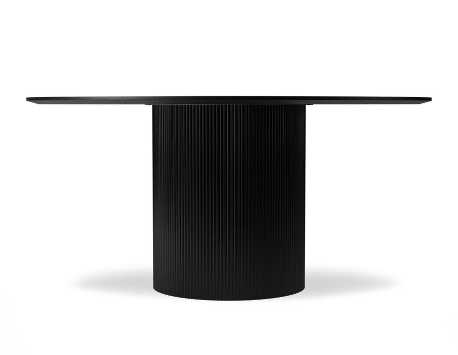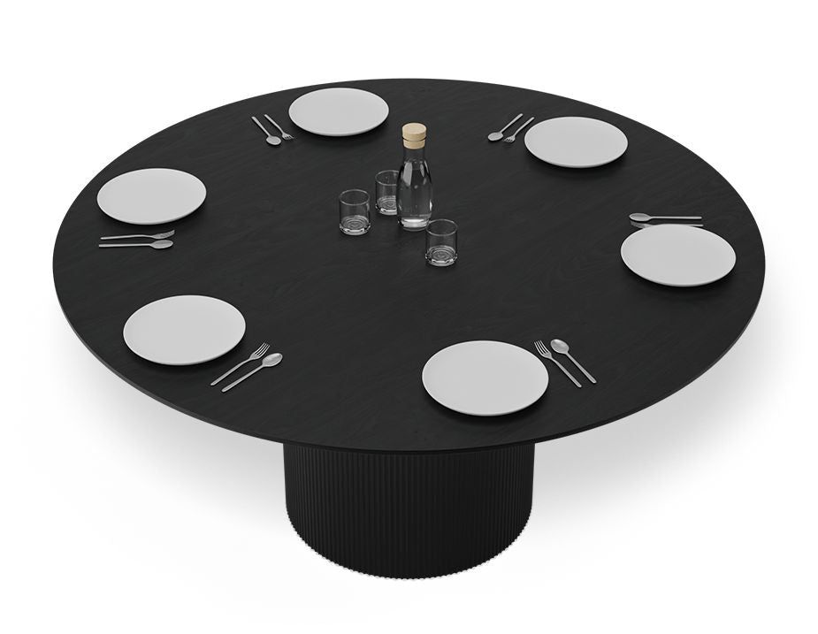 The Mimi Dining Table - Black - Black - 155cm is the perfect addition to any commercial space, particularly for restaurants, hotels, and cafes. With a diameter of 1550mm and a height of 750mm, this round dining table provides ample space for up to 6 guests, making it ideal for high-traffic dining areas. The sturdy base has a diameter of 750mm, providing stability for your guests. The 25mm thick top is made from black stained ash veneer or MDF, making it both durable and stylish. The overhang of 375mm ensures that guests can sit comfortably and enjoy their meal, while the black finish adds a modern and sophisticated touch to any dining area. This versatile and easy-to-match black dining table is a popular choice for project managers, interior designers, and furniture outfitters looking to create a dining area with a modern edge. Made from high-quality materials, the Mimi Dining Table - Black - Black - 155cm is a durable and practical option for any commercial space. The table's sleek black finish is perfect for those looking to add a touch of sophistication to their dining area. With a combination of style and functionality, this table is perfect for creating a contemporary dining space that guests will love. Whether you're looking to update your restaurant's interior design or create a cozy dining area in your hotel, the Mimi Dining Table - Black - Black - 155cm is the perfect choice. It's the ideal round dining table for those seeking a stylish and durable option that will stand the test of time.