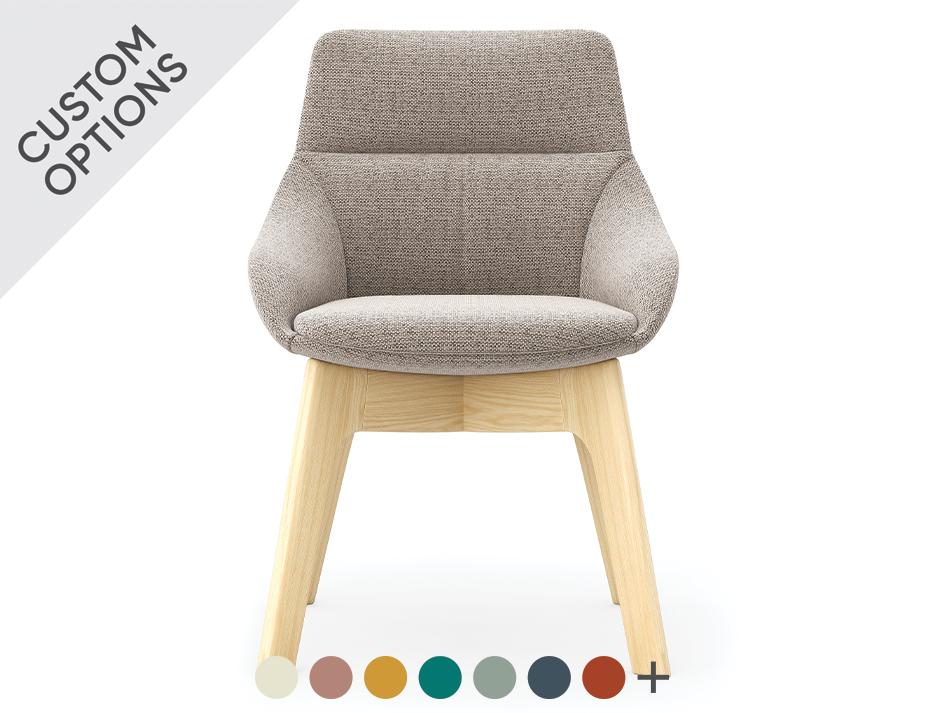 Upholstered Nola Armchair Low Arm with Solid Wood Base The Nola Armchair Low Arm Wood Base offers a relaxed, open‑arm profile with the warmth and elegance of natural timber. Part of the Sakura Collection, this upholstered low‑armchair pairs premium comfort with a solid American Ash base, making it a refined seating choice for workplace, commercial, and home environments. Premium comfort with natural timber character Built with premium‑grade moulded foam cushioning, the Nola Armchair delivers lasting comfort while its open low‑arm design promotes ease of movement. The solid American Ash base in a natural finish offers excellent stability and supports a weight capacity of up to 140kg. Upholstery options include DK Fabric, Thin Veins PU (Vinyl), and genuine Leather, giving you the flexibility to align the chair with your project's style and performance needs. Versatile seating for professional and residential spaces Measuring 60cm wide, 59cm deep and 82cm high with a seat height of 46cm, the Nola Armchair Low Arm Wood Base integrates seamlessly into meeting rooms, collaborative work areas, reception lounges, or modern living spaces. With its combination of comfort, craftsmanship, and natural materiality, it's a seating solution that balances durability and visual appeal across multiple settings.