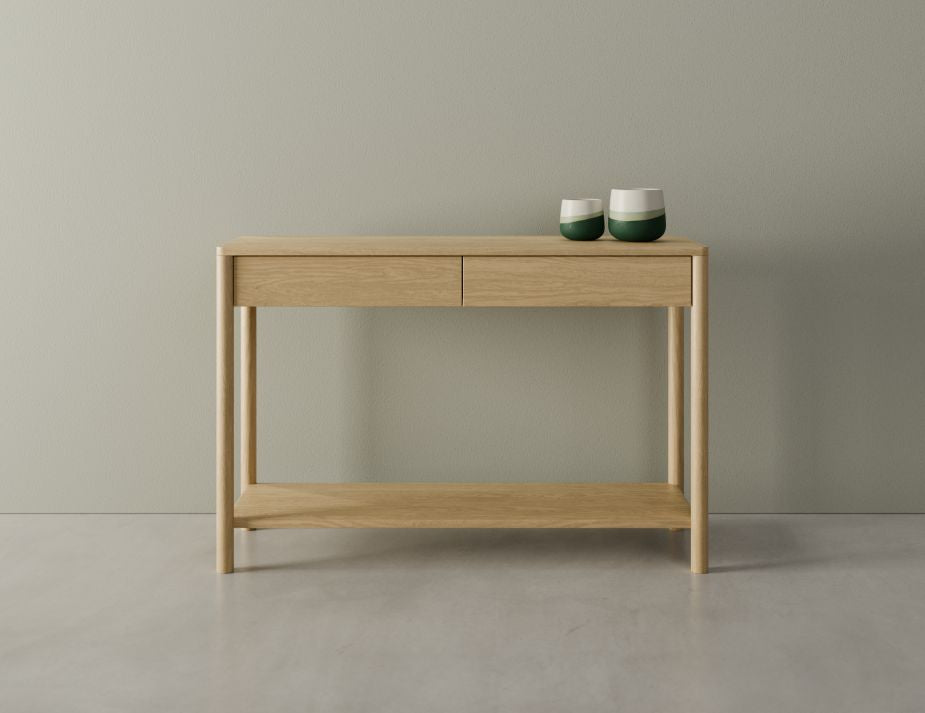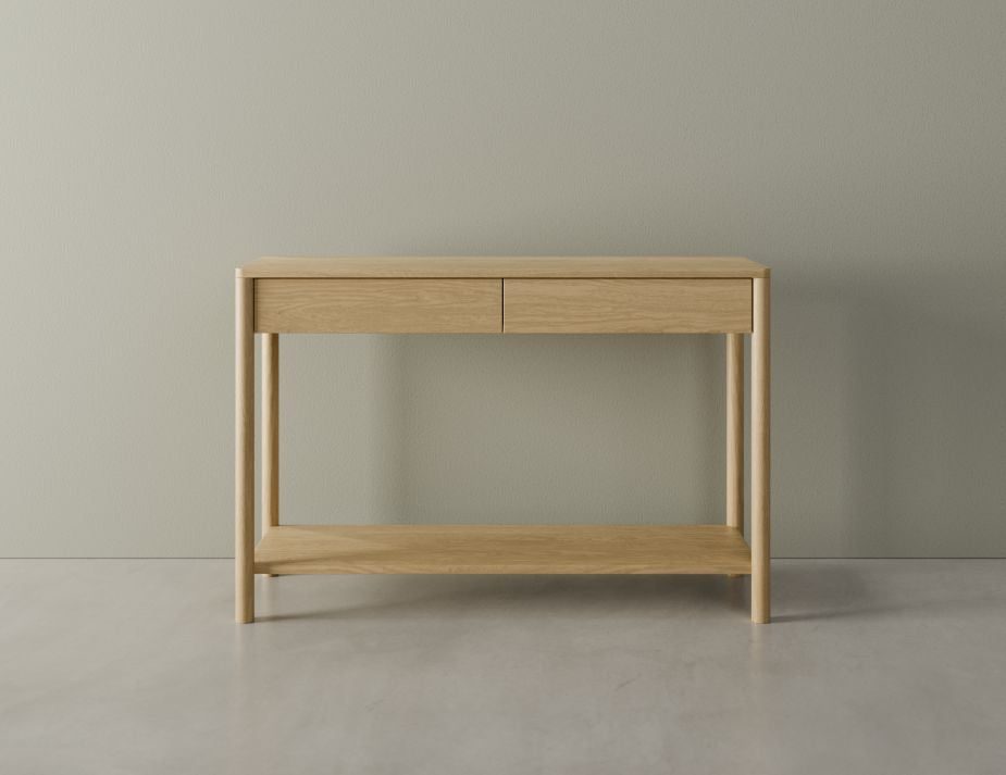 Revitalize Any Space with the Nordica Solid Oak Console Table The Nordica Solid Oak Console Table is the epitome of sleek design and functionality. Ideal for narrow hallways or small living areas, this wooden console table measures 115 cm in width, making it a perfect fit for compact spaces. With its dual drawers, the Nordica provides essential storage, making it an excellent entryway console table for organizing keys, mail, and other necessities. Its streamlined design not only maximizes space but also adds a modern touch to any room, making it a versatile addition to any interior design portfolio, from residential homes to commercial settings. Sturdy and Stylish: The Nordica's Solid Oak Construction This small console table is constructed from high-quality solid American oak, ensuring both durability and aesthetic appeal. The robust construction supports everyday utility while offering the timeless charm of wood console table furniture. Ideal for trade customers and designers, the Nordica oak narrow console table seamlessly blends with both contemporary and traditional decor, proving itself as a functional and attractive hall console table that stands the test of time. Refined Natural Oak Finish: Elevate Your Design Projects The Nordica Oak Console Table with drawers features a beautiful natural finish that enhances fine craftsmanship. The warm tones of the solid oak bring a cozy, inviting feel to any environment, making it an ideal choice for those looking to create a welcoming atmosphere with a modern console table. Whether positioned in a bustling entryway or as a focal point in a hallway, its understated elegance and superior functionality make it a top choice among modern, narrow console tables for hallways and other spaces.