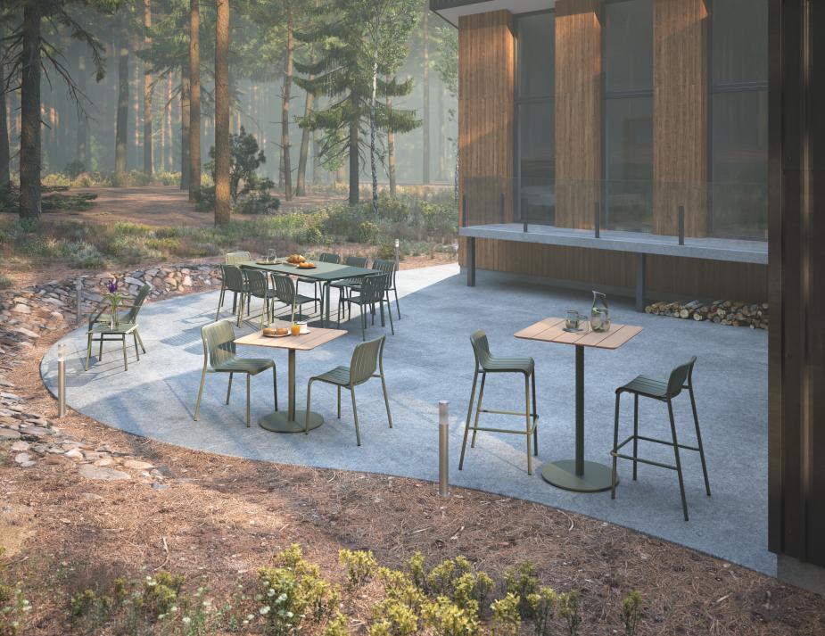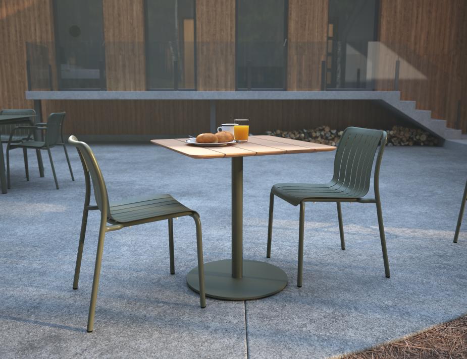 Roku Green Cafe Teak Table - Nature-Inspired Elegance in Matte Eucalyptus Green Bring a refreshing, nature-inspired vibe to your outdoor dining area with the Roku Cafe Teak Table in Matte Eucalyptus Green. This stunning green outdoor table is designed to complement open-air spaces in cafes, bistros, and restaurants, offering a perfect balance of modern design and organic warmth. With its eye-catching eucalyptus green frame and timeless teak top, the Roku Café Table stands out as a stylish and practical choice for commercial outdoor settings. Roku Cafe Table: A Blend of Modern Aesthetic and Commercial Durability The Roku Cafe Teak Table, crafted by Bent Design Studio, is designed to elevate any outdoor dining experience. The matte eucalyptus green powder-coated aluminium frame brings a unique, natural hue that blends harmoniously with outdoor environments, while the solid teak tabletop adds durability and charm. Ideal for patios, courtyards, and terraces, this table is engineered to endure the daily demands of commercial use, with adjustable nylon foot glides to ensure a stable dining surface, even on uneven ground. The Ideal Table for Cafes and Bistros: Key Features of the Roku Cafe Table Distinctive Eucalyptus Green Frame: The vibrant matte eucalyptus green finish offers a refreshing alternative to traditional outdoor furniture, creating a standout look for your venue. Weather-Resistant Teak Top: Teak is naturally resistant to the elements, ensuring that your table remains beautiful and functional even after years of outdoor exposure. Versatile Size Options: Available in 65x65 cm or 75x75 cm, allowing you to optimise your space and seating layout. Commercial-Grade Durability: Designed for high-traffic commercial settings, the aluminium table's robust materials ensure long-lasting performance. Adjustable Foot Glides: Nylon glides provide stability on uneven surfaces, offering guests a comfortable dining experience. Contemporary Aesthetic: The combination of a sleek eucalyptus green frame with the warmth of teak makes this table a modern and inviting option for outdoor dining. Height: Standing at 75 cm, this table is perfect for comfortable cafe or bistro seating arrangements. Effortless Assembly: With basic assembly required, you'll have this green table set up and ready to go in no time.