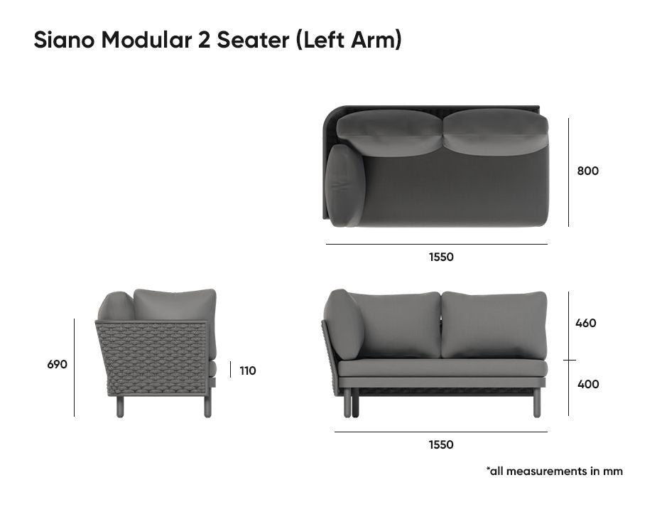 The Siano Modular Left Arm 2 Seater is a premium outdoor sofa solution for commercial project managers, interior designers, and furniture outfitters looking to enhance their outdoor spaces. The sofa features a stylish and durable design, made from powder coated aluminum in a matte charcoal finish and finished with comfortable dark grey textilene fabric cushions. With a seat width of 155cm, seat depth of 80cm, and seat height of 40cm, the Siano Modular Left Arm 2-Seater provides ample seating for two people. This outdoor sofa is designed to be part of the larger Siano Outdoor Sofa collection, enabling you to create unique and customizable seating configurations. The arm height of 69cm and overall seat height of 69cm make this sofa ideal for outdoor lounging, while the 11cm seat cushion thickness and 46cm back cushion height provide comfortable seating. No assembly is required, making it easy to incorporate into your outdoor space, and the high-quality materials ensure that it will last for years to come. Whether you are looking for a seating solution for a hotel terrace, bar patio, or residential outdoor space, the Siano Modular Left Arm 2-Seater is the perfect choice for any commercial space that requires comfortable and stylish outdoor seating.