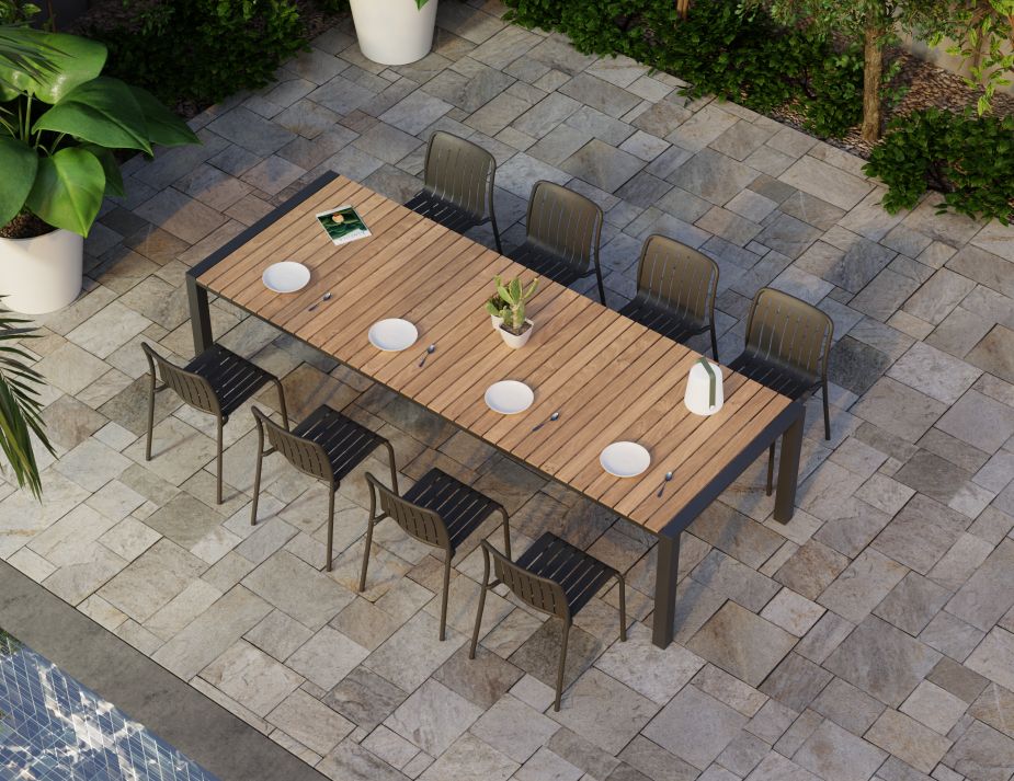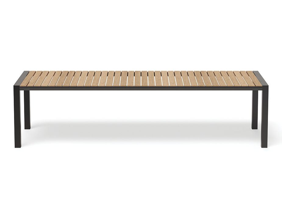 The Vydel Table from Bent Design Studio is a versatile and stylish addition to any residential or commercial space. The charcoal color of the frame will complement any outdoor or indoor décor, making the Vydel Table a versatile choice for interior designers and furniture outfitters companies. Measuring 300cm in length, 110cm in width, and 75cm in height, this table is designed to accommodate large groups of people, making it ideal for outdoor dining, hotel dining areas, and bar settings. The solid teak top provides a sturdy and attractive surface, while the powder coated aluminum frame adds a touch of contemporary style. Suitable for both indoor and outdoor use, the Vydel Table is built to withstand the elements and provide a durable and long-lasting seating solution. Whether you're looking to furnish a hotel dining area, a bar or a residential outdoor space, the Vydel Table is a stylish and practical choice that will meet your needs. With its combination of a solid teak top and powder coated aluminum frame, the Vydel Table offers both functionality and style, making it a popular choice for those looking to upgrade their commercial furniture. If you're looking for a table that is both functional and stylish, the Vydel Table from Bent Design Studio is the perfect choice for your next project.