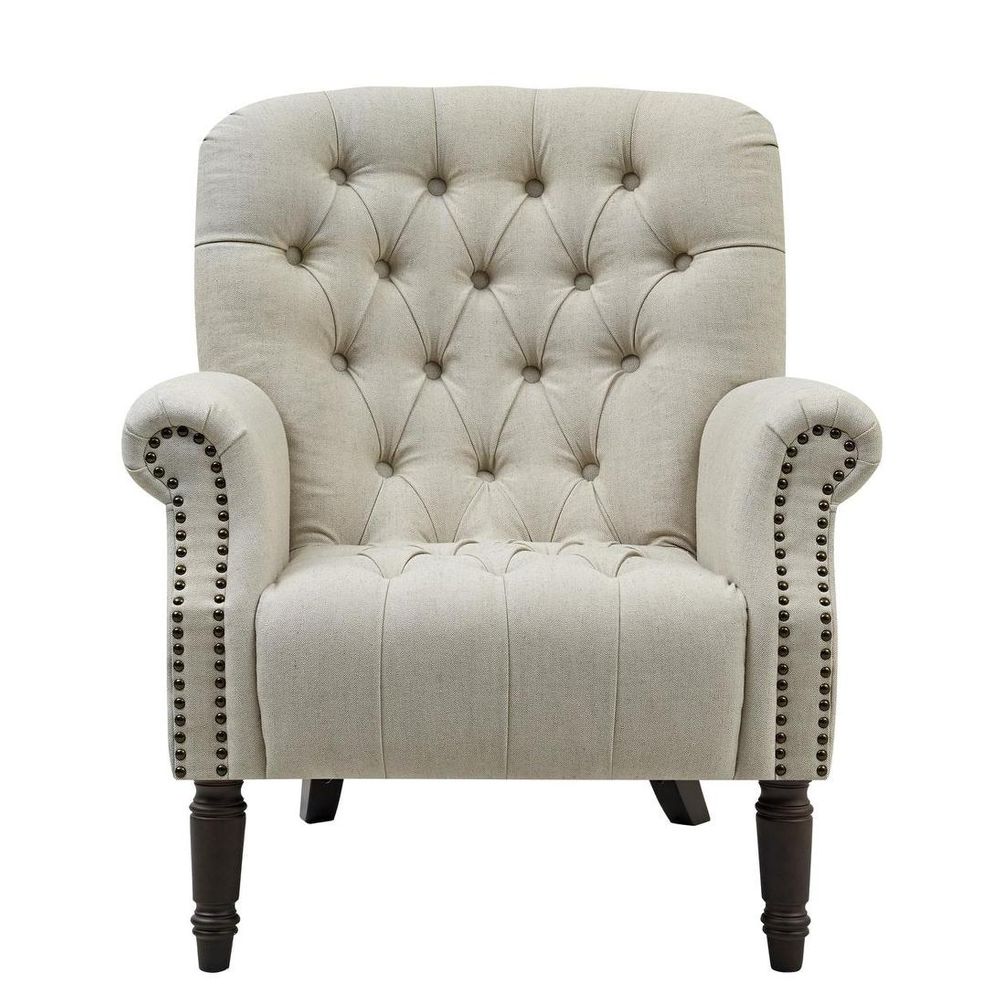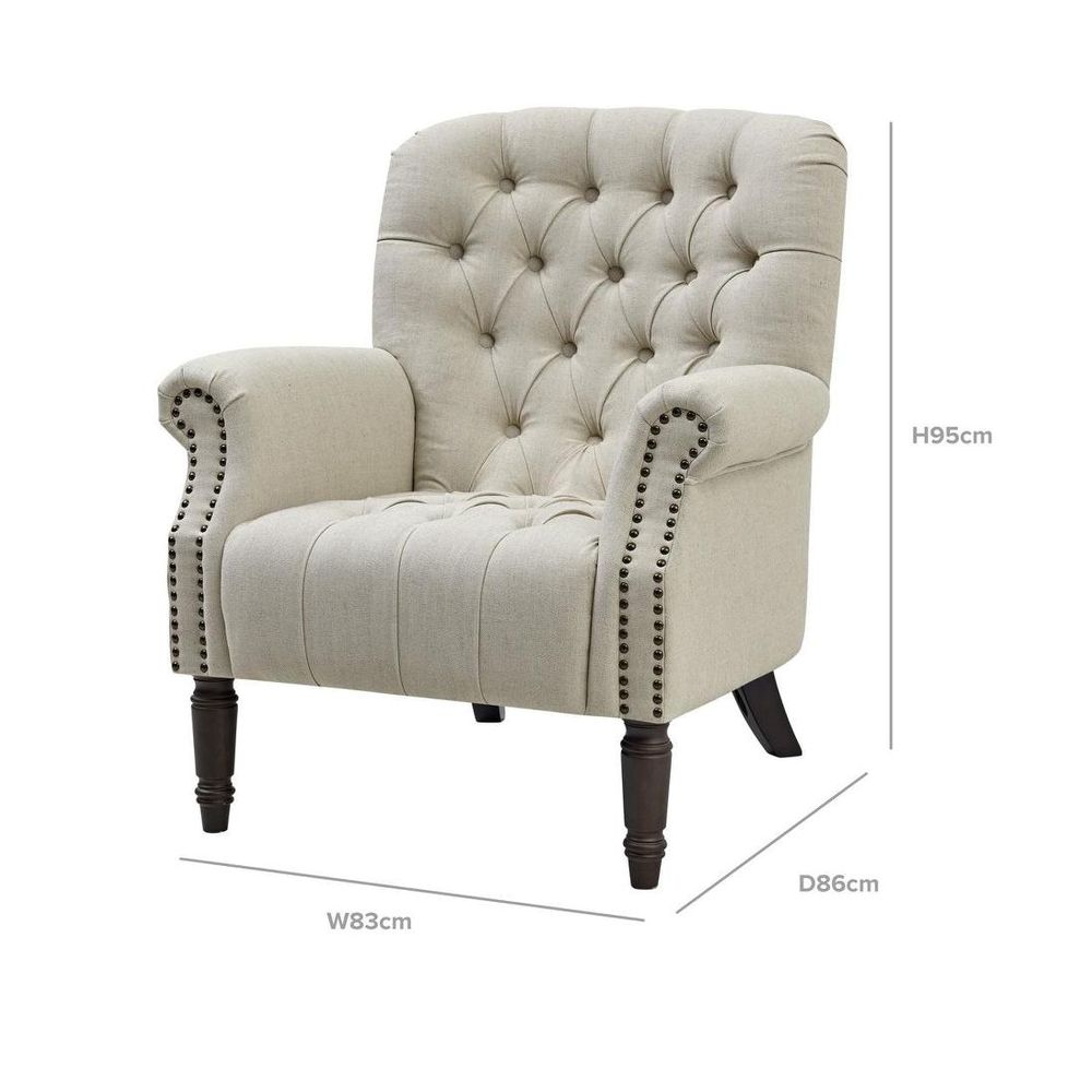 Maurice Natural Linen Blend Hamptons Buttoned Armchair W/Studs Dark Legs