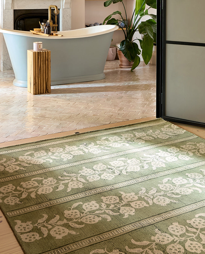 A symbol of life in Hindi, Anaar features stylised pomegranates and leaves interpreted in this stripe design. Reimagined as a hand-loomed rug, it comes in natural colourways of green and flax. Handtufted in India from 100% pure new wool, this rug features an 11 mm pile for plush comfort