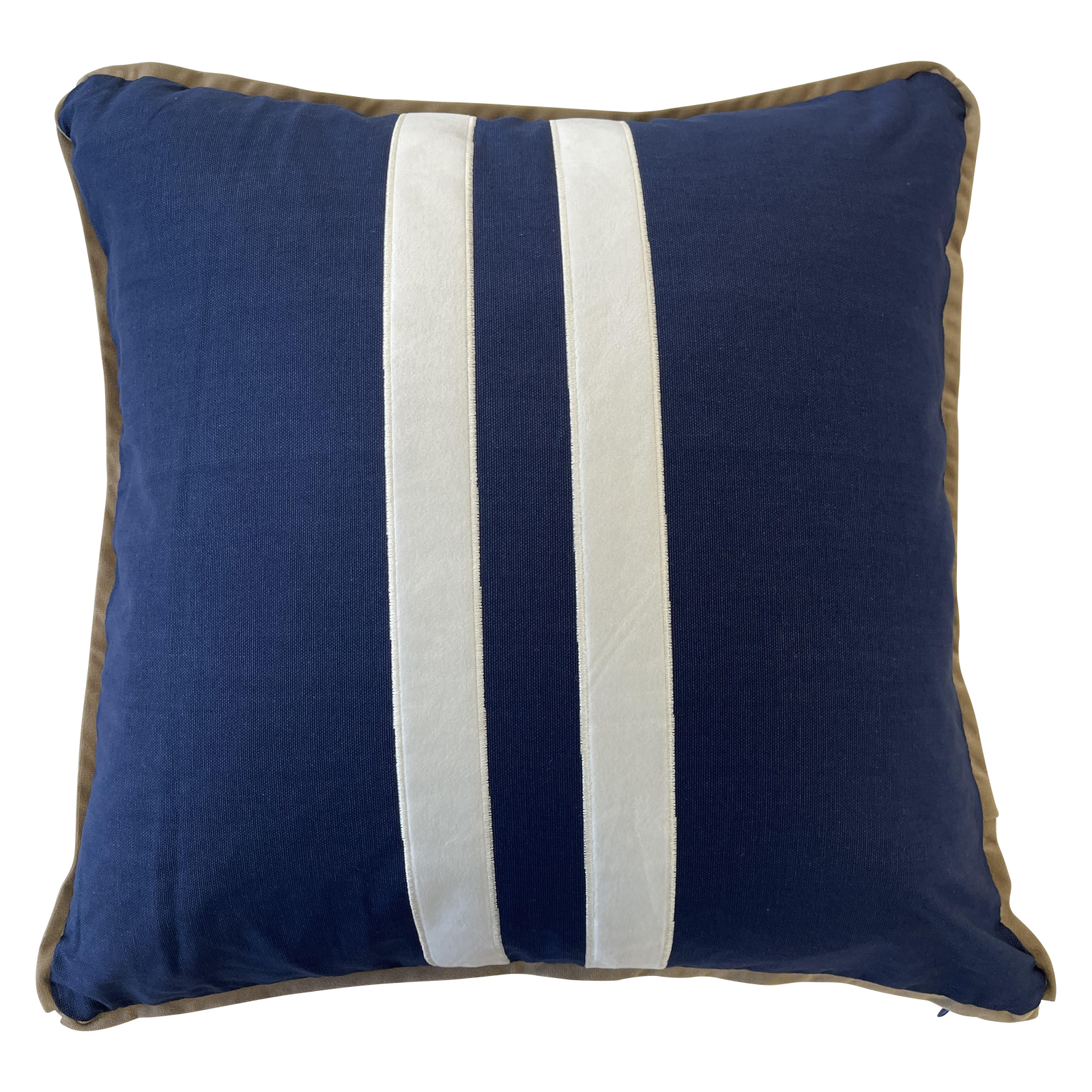 Rich navy cotton canvas with delicate white applique stripes completed with tan velvet trim have been combined to create this eye catching design. Perfect for those that love the nautical theme. Size: 55 x 55 cm Fabric: Navy cotton with crisp white velvet applique and tan velvet piping