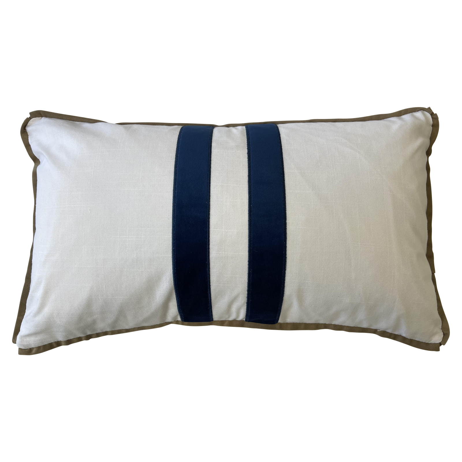 Crisp white cotton canvas with delicate navy applique stripes completed with tan velvet trim have been combined to create this eye catching design. Perfect for those that love the nautical theme. Size:35 x 60 cm Fabric: Crisp white cotton with navy velvet applique and tan velvet piping