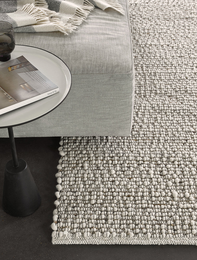 Contemporary and calm, this modern flatweave rug stuns with its comforting neutral hues and luxurious tactile design. Charmed with cool grey and ivory tones, Tumble displays speckled hues of gold and hazel that accentuate its intricately woven pebbled texture. Tumble has been masterfully handwoven from a luscious pile of pure new wool that makes it an ideal choice for adding a touch of natural texture to your interior.