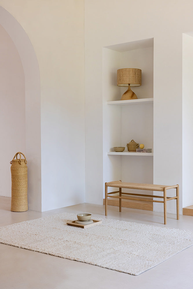 Discover the timeless charm of our handcrafted creations, where tradition meets artistry in every fiber. Embracing the beauty of irregularity, no two pieces are the same, making each item a unique masterpiece. The FUNDAMENT shows us bold and monolith shapes in undyed, handspun wool combined with an earthy jute. Monumental designs made to master the room. Versatile in use; the rug is reversible.