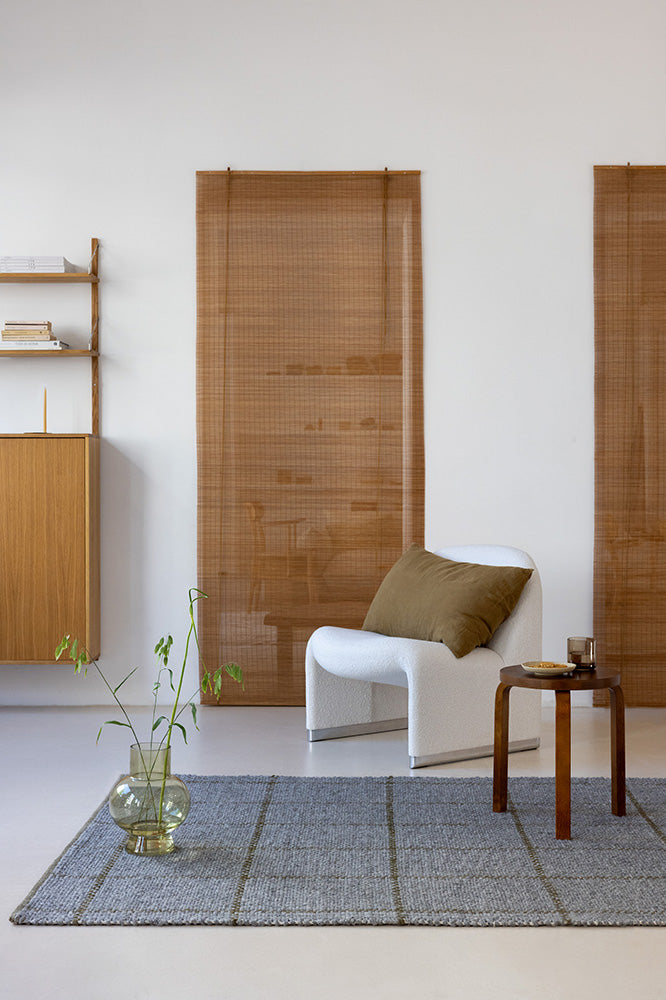 Discover the timeless charm of our handcrafted creations, where tradition meets artistry in every fiber. Embracing the beauty of irregularity, no two pieces are the same, making each item a unique masterpiece. The series MATTER is a double weave, the back is made of cotton, the top features a basketweave in a window pane pattern made from undyed and dyed wool. The small borders are woven in a contrasting colour in cotton.