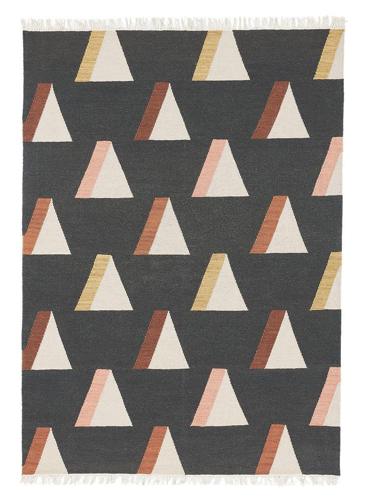 Presenting a geometric triangle pattern in harmonious contemporary tones, the Wigwam rug from Brink & Campman is perfect for any interior. Flatwoven from pure wool in charcoal grey, a layer of fringe lines either end, adding a distinctly bohemian touch. Particularly well-suited for Scandinavian, bohemian and contemporary style interiors, place in a living room or dining room for a striking focal point.