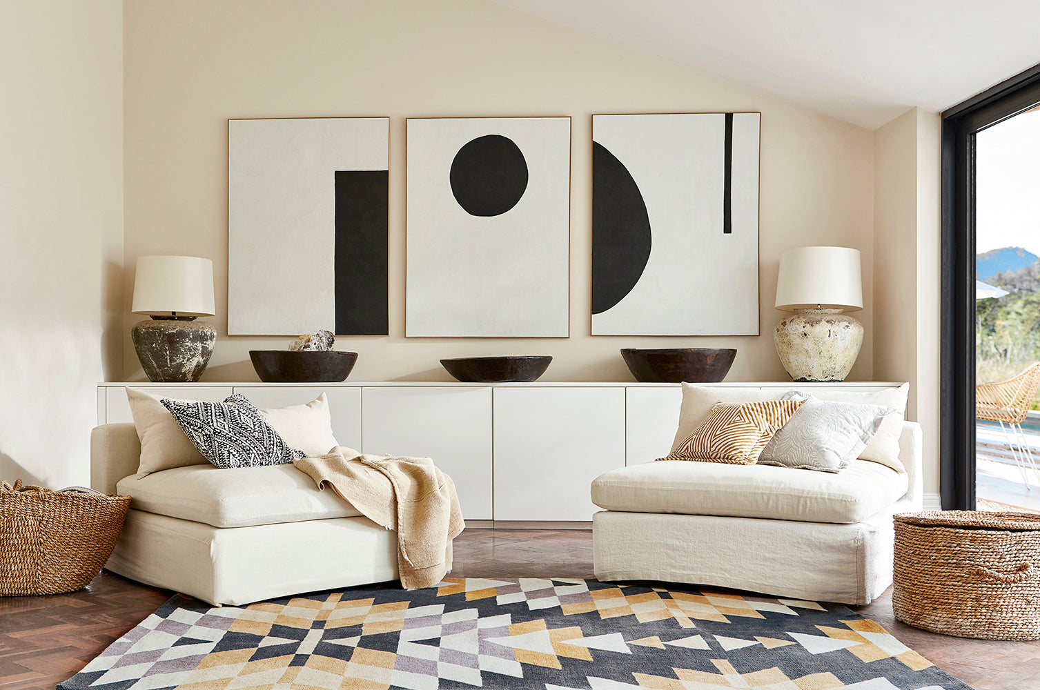 Mirrored geometric shapes repeat across the Elwana Rug by Harlequin to create a modern Aztec inspired rug. Inspired by kilim rugs, this contemporary design has a plush 12mm pile, hand-tufted in India using pure new wool creating a luxury feel underfoot.