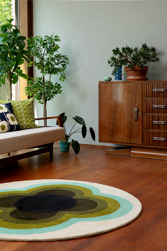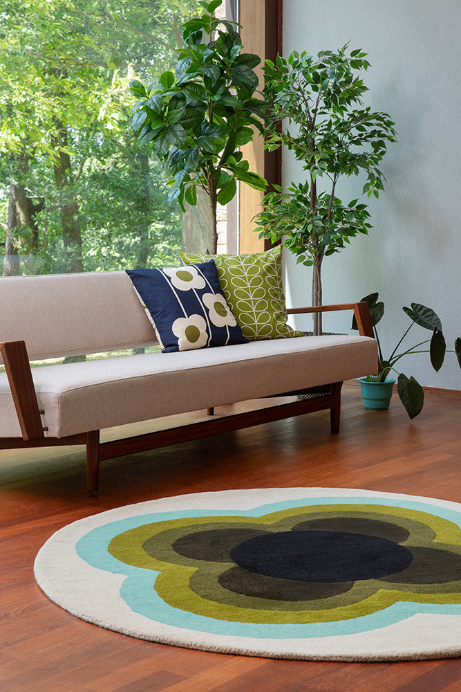 In the Sunflower Olive rug by Orla Kiely, her profound appreciation for mid-century design shines through. With a round design, this rug features a mesmerizing and rhythmic floral pattern. The colour palette elegantly merges olive hues with subtle aqua and white accents, reflecting Kiely's journey of modernism built upon mid-century foundations. Hand-tufted in India using 100% pure new wool, this rug not only exudes quality but encapsulates Orla Kiely's passion for creating timeless pieces that transcend design eras. Welcome a touch of mid-century magic into your space with this beautifully crafted and artistically inspired rug.
