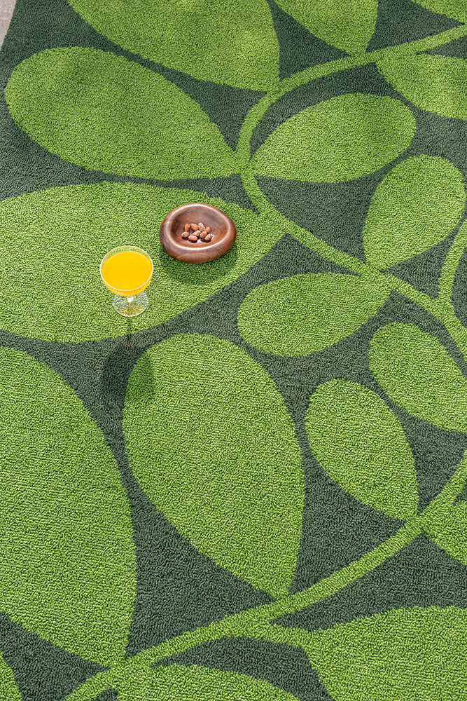 Creating movement with its vine-like shape weaving upwards, this design uses graphic shapes inspired by sycamore tree seeds. Retro and playful, this rug is perfect for embracing a modern mid-century look in your home. Expertly hand-tufted from 100% recycled PET, it combines sustainability with style.