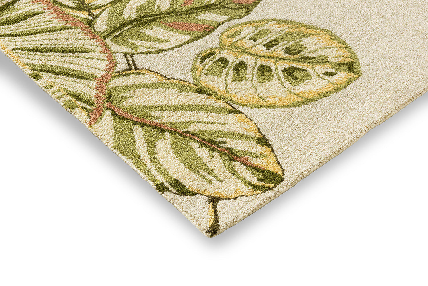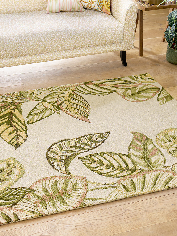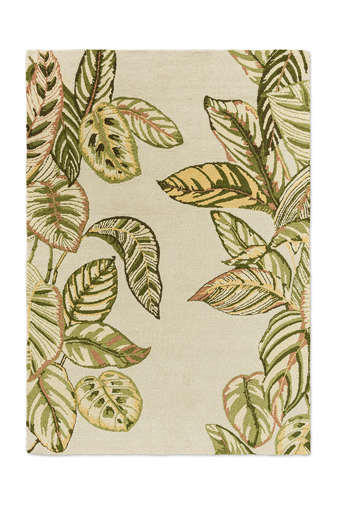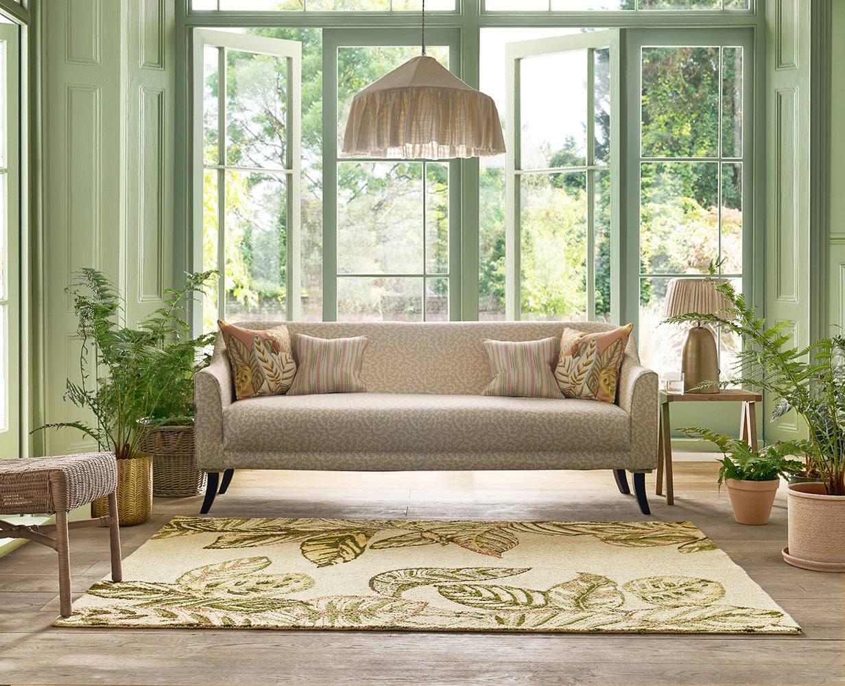 Originating in Brazil, the Calathea or 'Prayer Plant' was a favourite for illustration in the late 19th century due to its remarkable decorative foliage. Elegant and strikingly detailed, this rug from Sanderson creates a striped pillar of abundant tropical leaves. Expertly hand-tufted from 100% recycled PET, it combines sustainability with style.