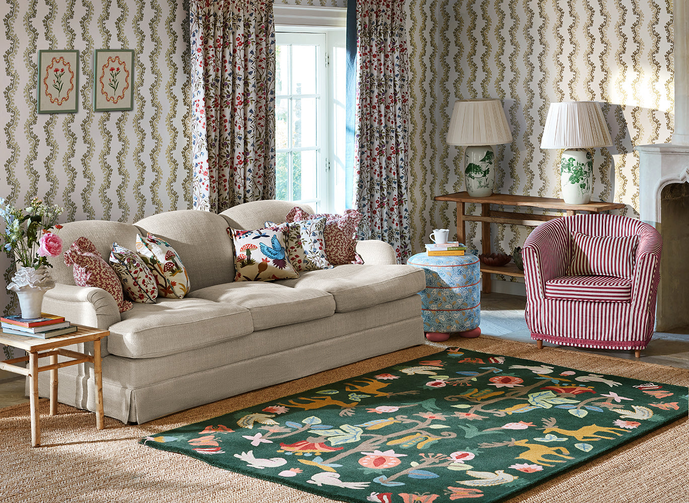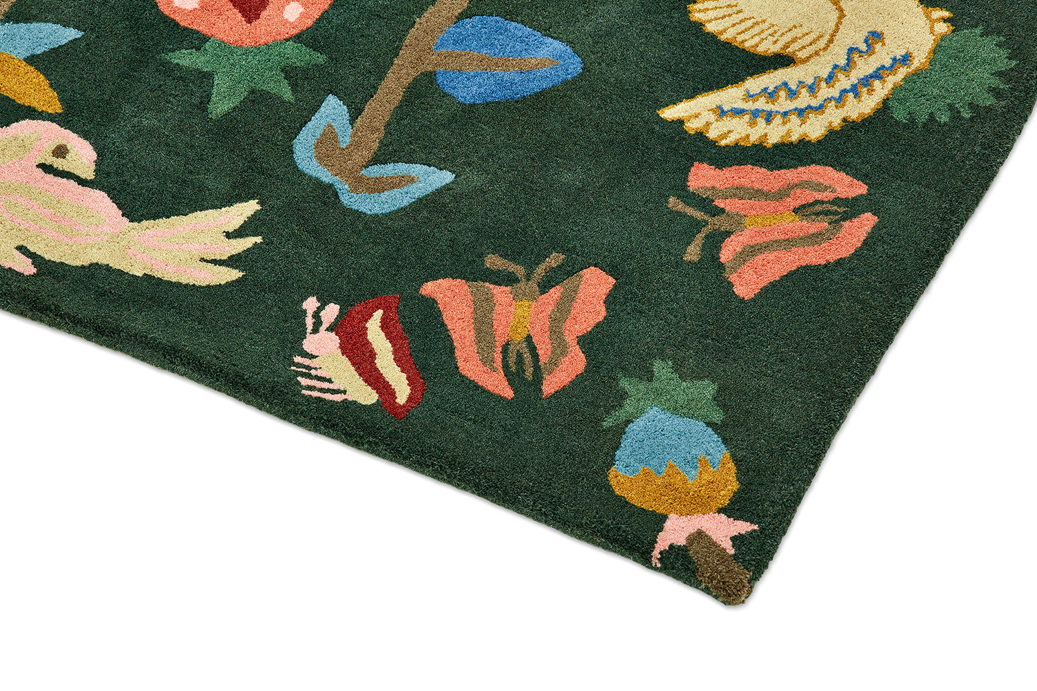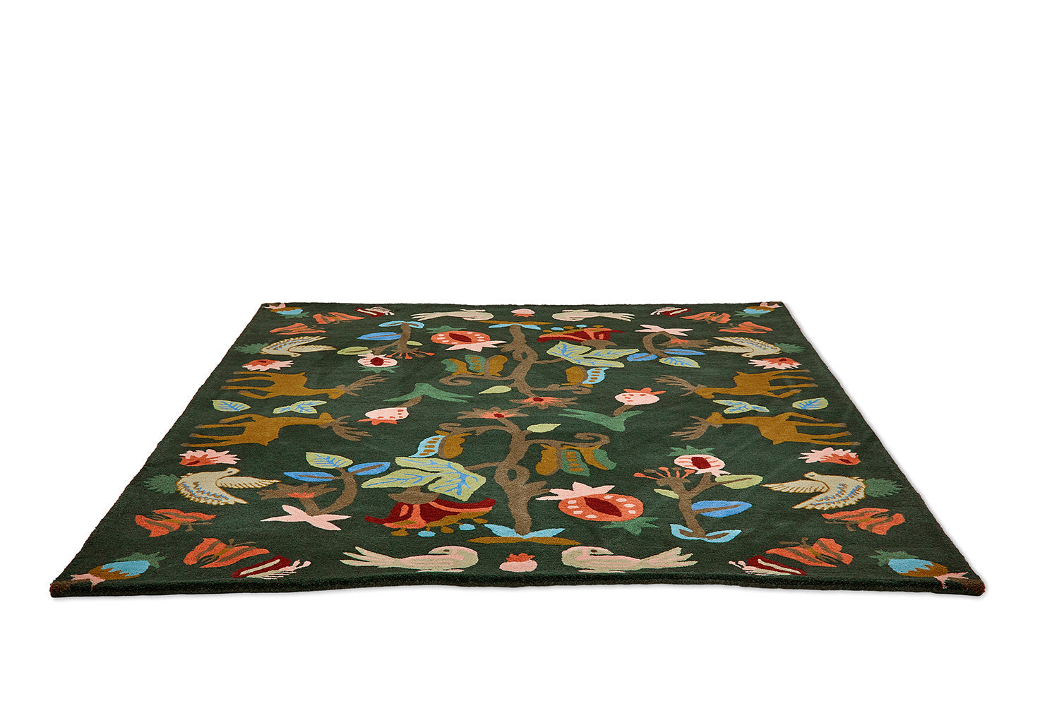 A magical interpretation of an age-old woodland scene, Forest of Dean, an embroidery in its original design, is a more whimsical takeon the forest floor dwellers, revealing a naïve aesthetic of deer, fernsand butterflies. Here in rug form it has an almost Scandinavianquality, whilst still remaining firmly footed in the English countryside.