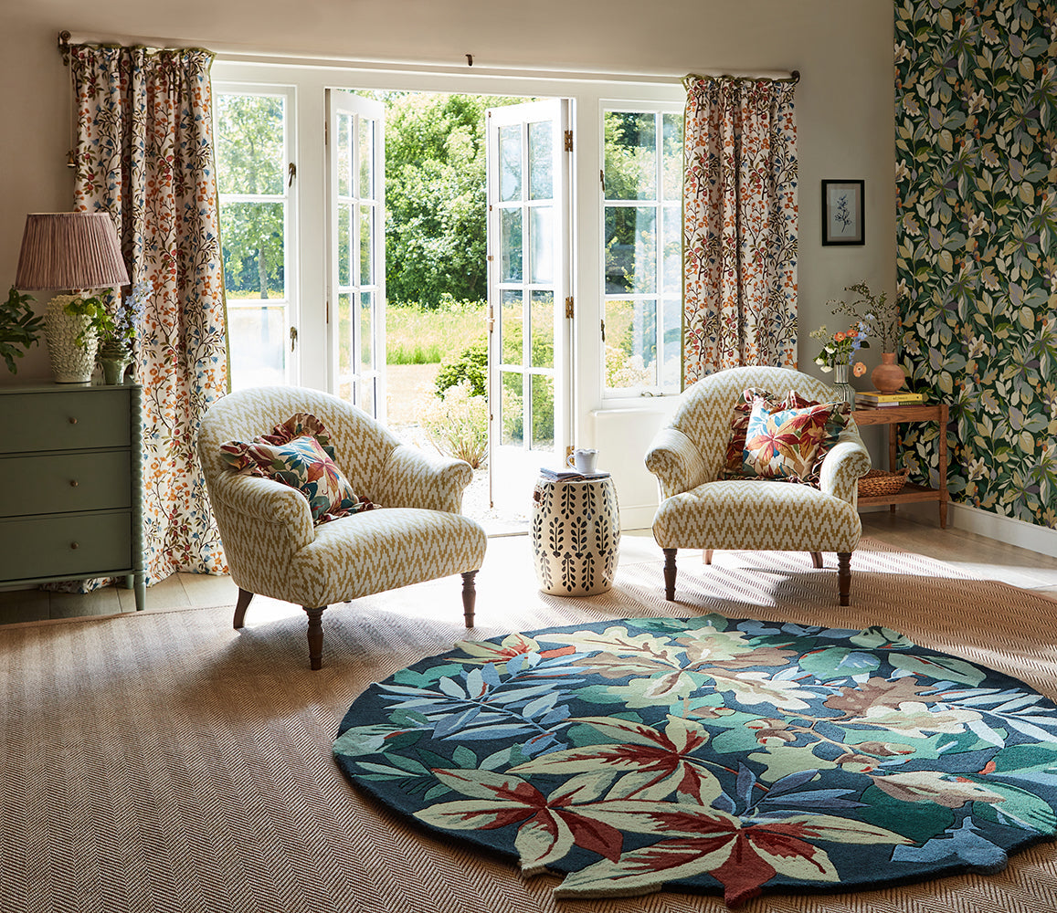 Taking its name from Robin's Wood, an area of diverse flora, fauna and ancient woodland thought to date back to after the last ice age, this all-over design of oak and sycamore leaves is inspired by an archive document. Sumptuous rich colours allude to the changing seasons, with the carved edges of the rug adding depth to the ground and exaggerating the luscious leaves within the design.