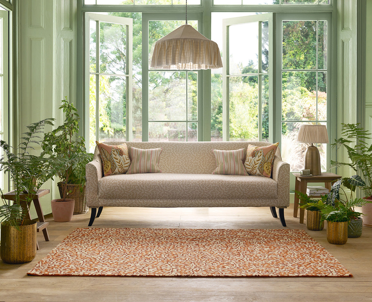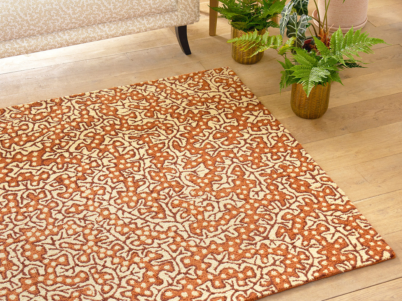 Like the cross section of a truffle, this archive design is made from lines of pin dots on a spotted ground. A lovely mix of texture and tone, use as a coordinate to the entire Sanderson range. Expertly hand-tufted from 100% recycled PET, it combines sustainability with style.