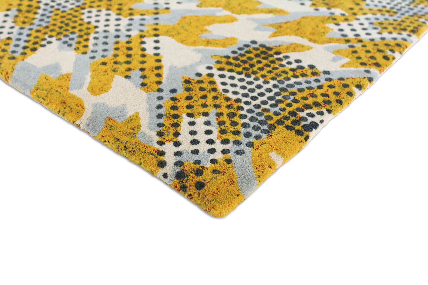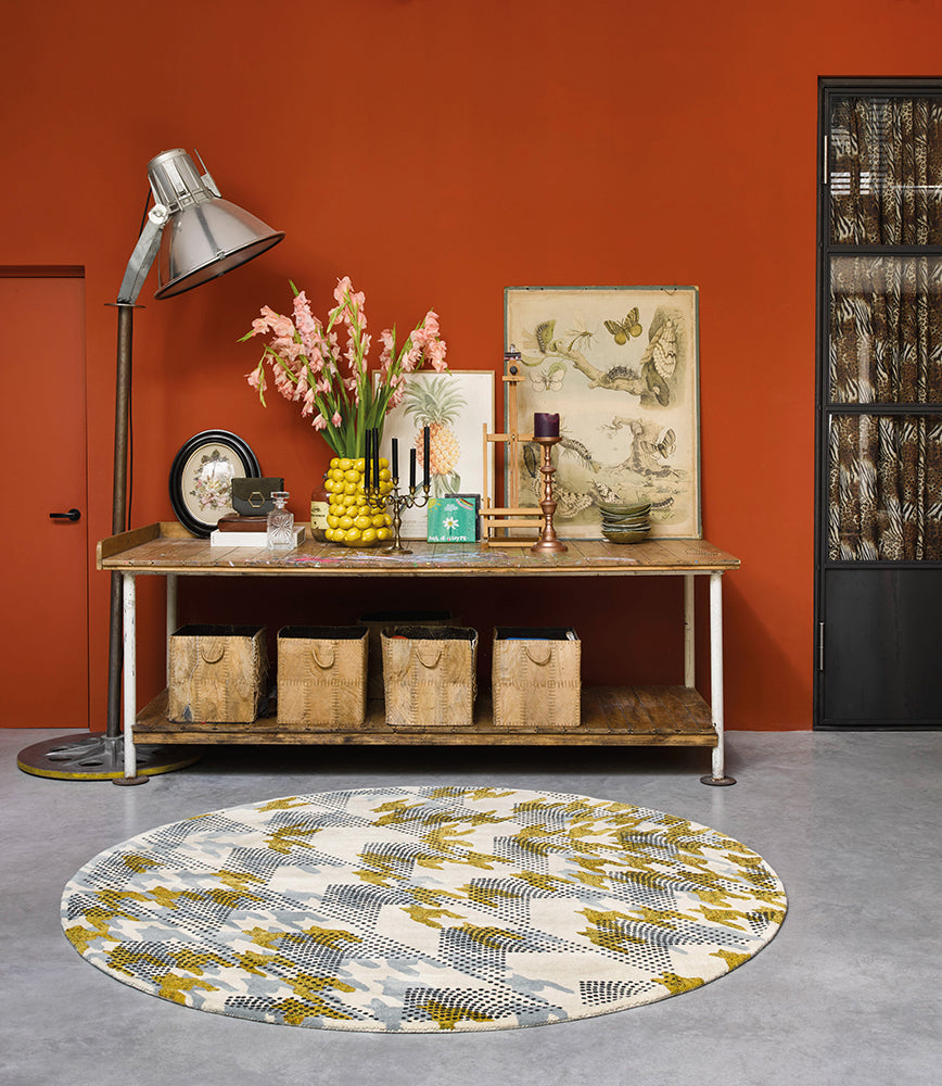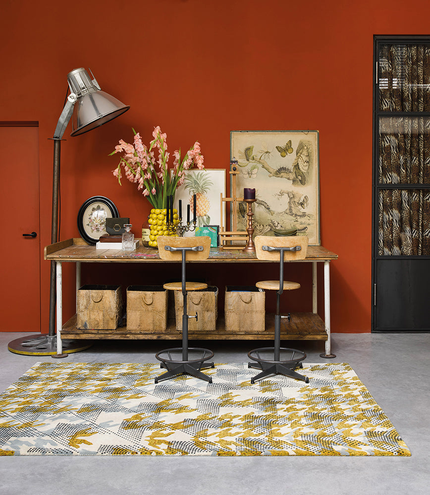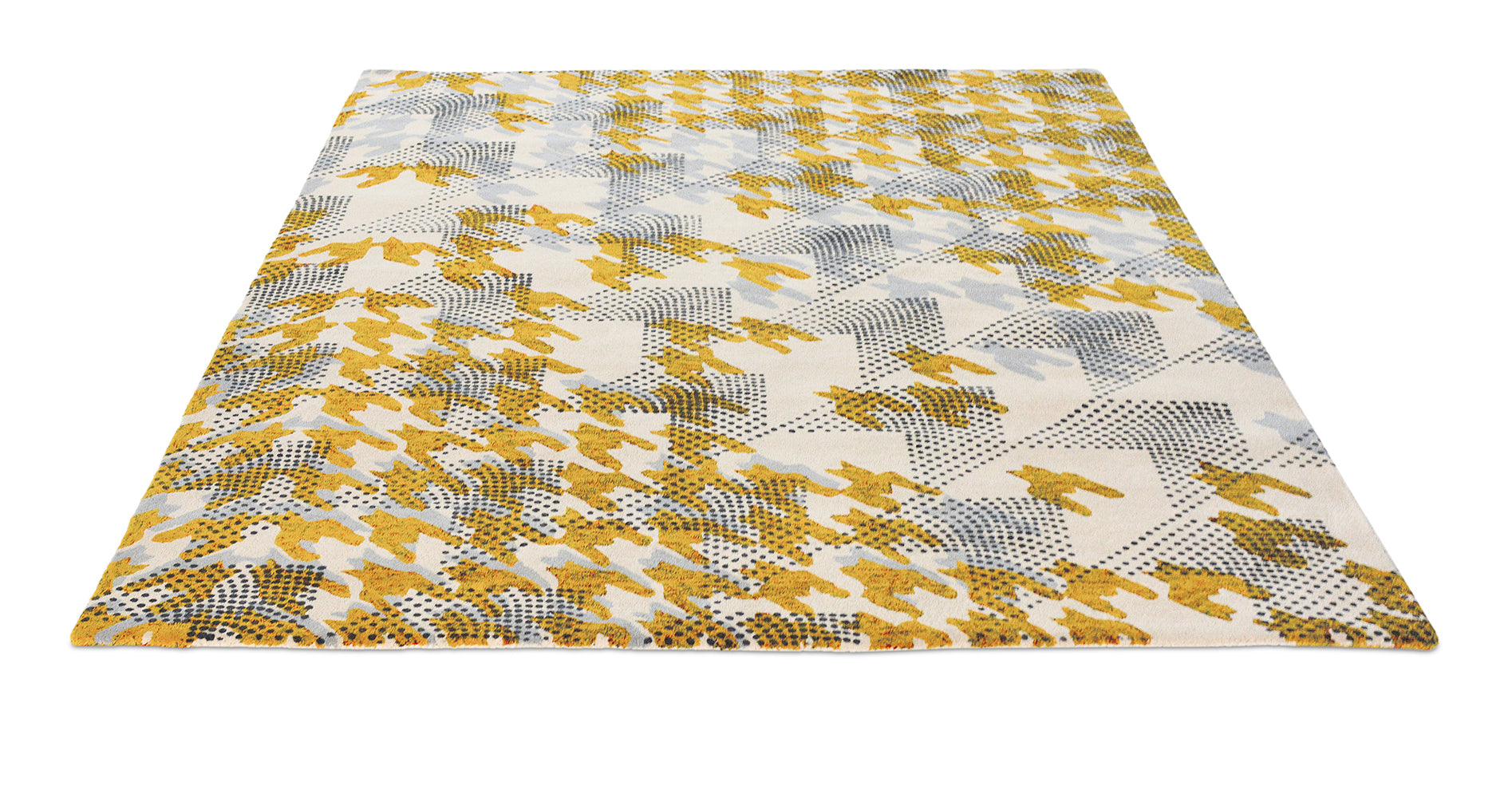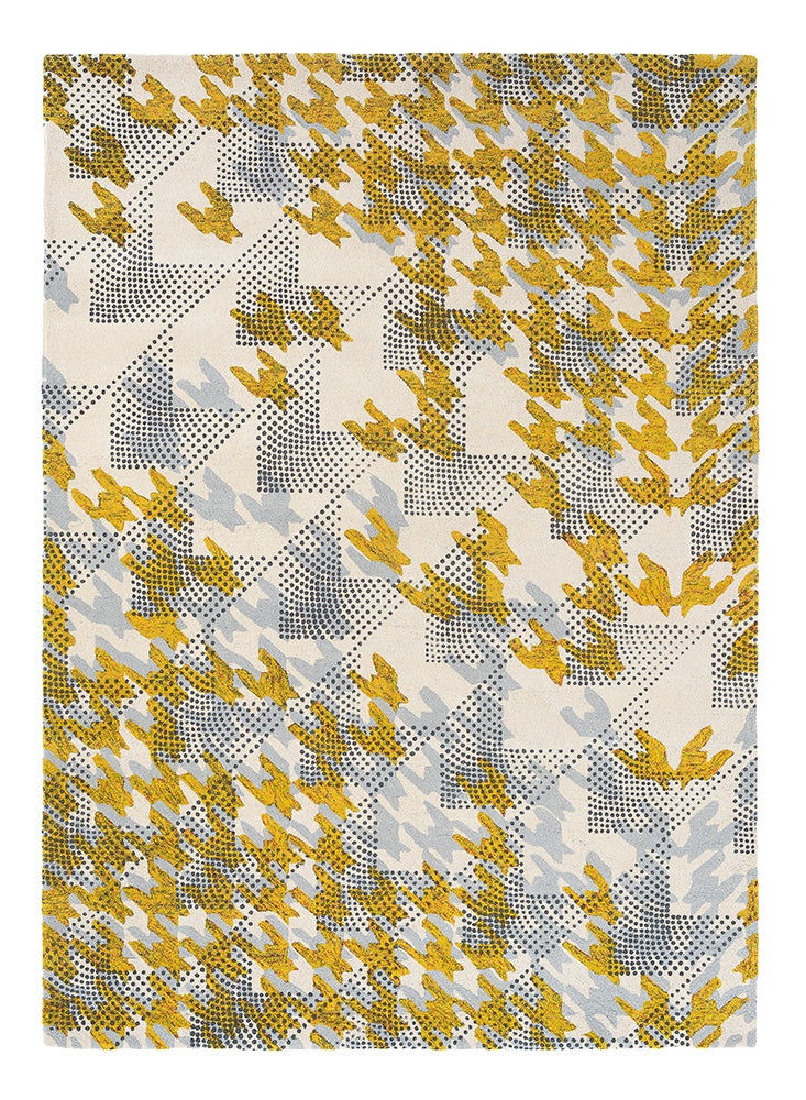 A contemporary take on a classic pattern, Ivory Atlas features a grey and ochre houndstooth, covered in finely dotted arrows. This rug will bring a sense of modernity and sophistication to any room. Made from 28% recycled wool, this eco-friendly rug is hand tufted and screen-printed in India.