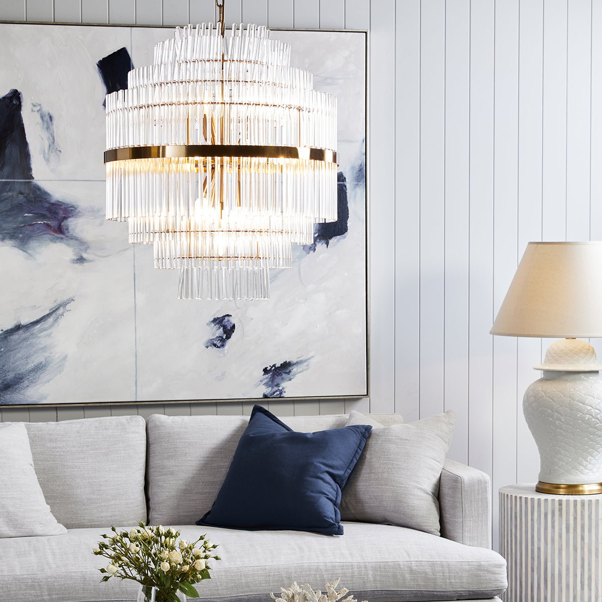 Grand in size and sculptural form, the Lawrence pendant finds a sense of balance between exceptional elegance and extraordinary drama. Crafted with hundreds of clear glass rods delicately dangling from a polished brass frame, the design echoes art deco glamour. The Lawrence pendant commands any living space