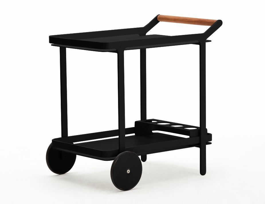Width : 78.5cm, Depth : 50cm, Height : 82cm, Timber Handle : FSC Certified Teak, Frame : Aluminium powdercoated, Color : Matt Black, Wheels : Rubber Edged, Designer : Bent Design Studio