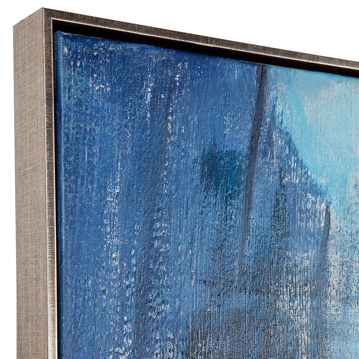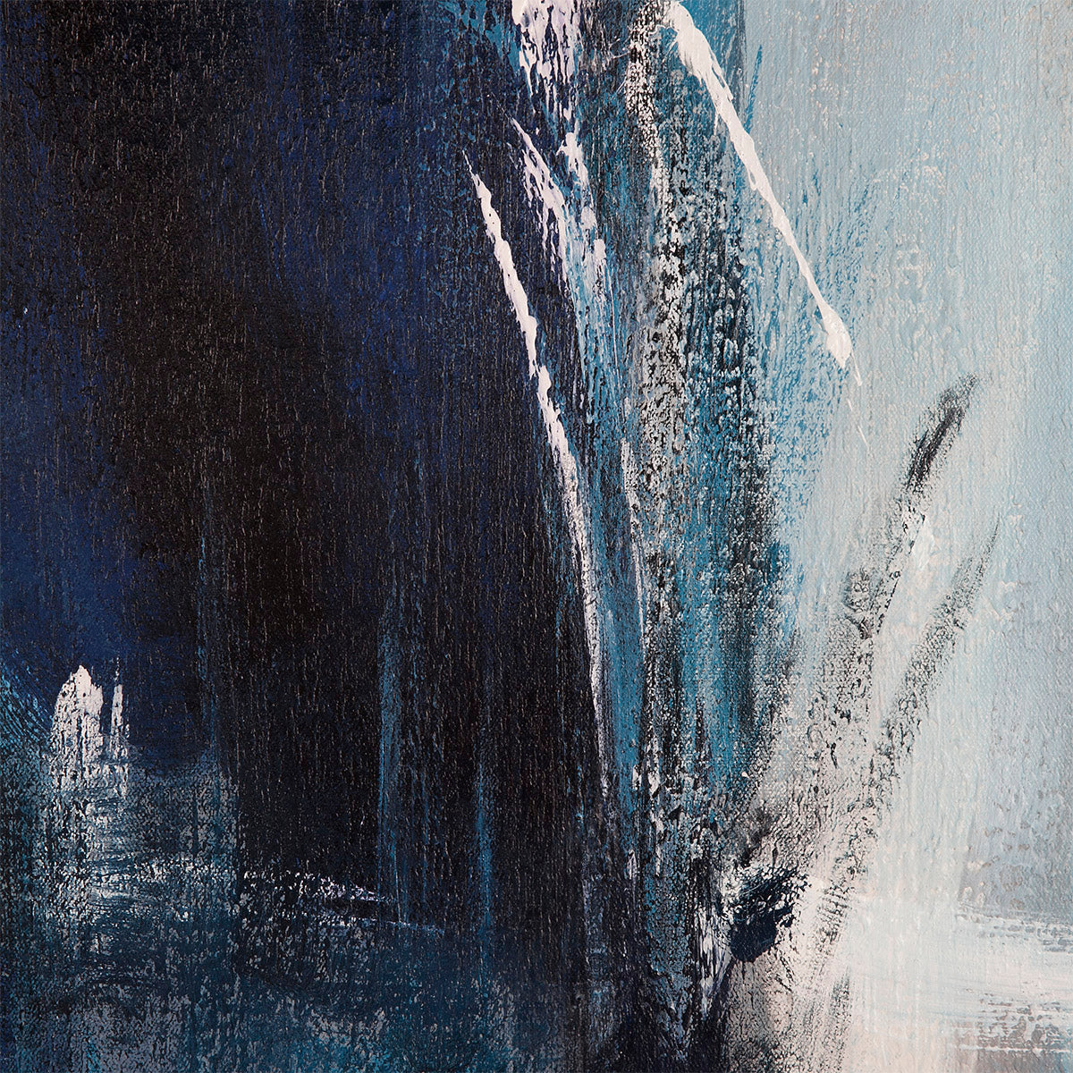 Variety of dark blue, navy blue, white and grey oil paints blended together on a canvas.
