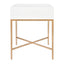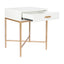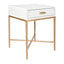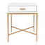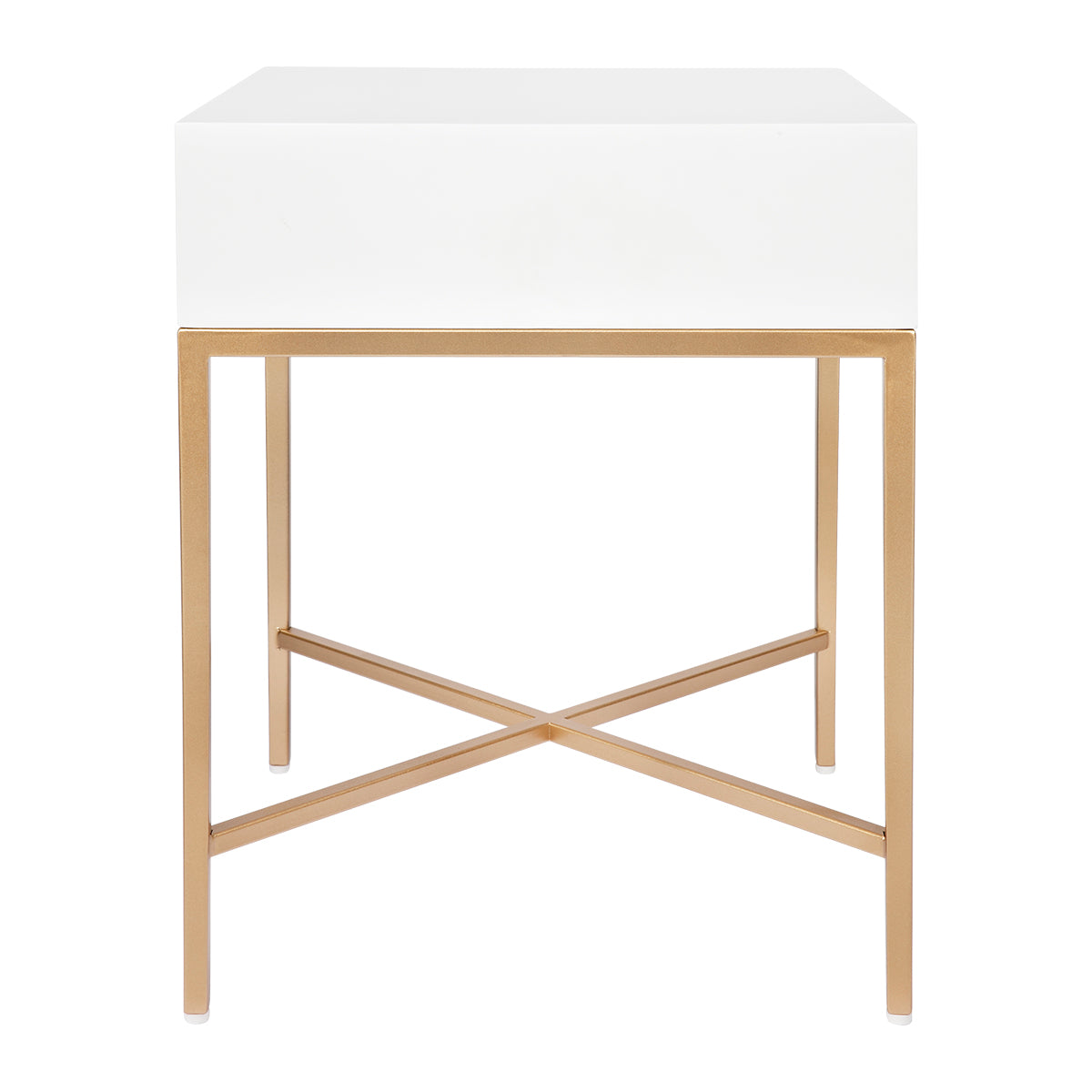 Sleek and refined, the Nessa bedside table is available in a playful myriad of finishes to suit your bedroom or living room. Featuring a lacquered crisp white finish sitting atop a minimalist brushed gold tapered metal frame and coordinating drawer pull adds an element of charm to this petite single drawer bedside table.
