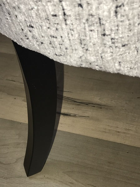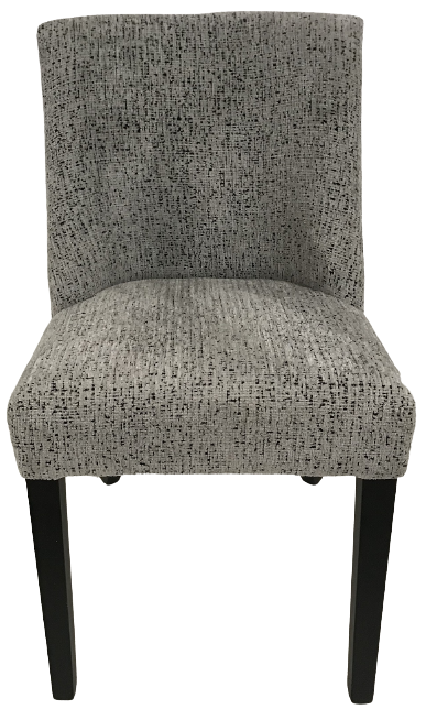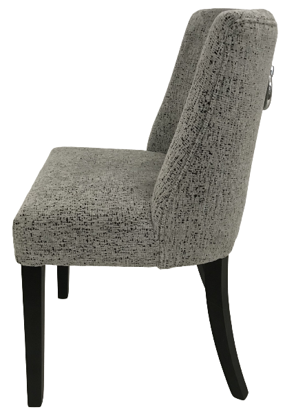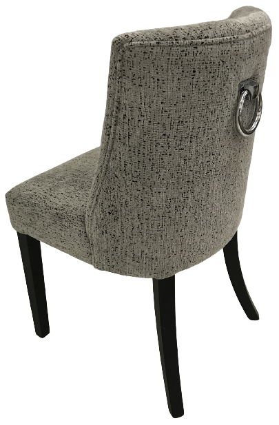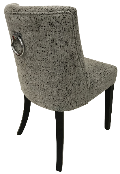 Elegant dining or bedroom chair has been upholstered in a tweed style fabric and features a silver ring pull handle on the back of the chair. This chair has black coloured legs. Warranty: 1 year - under fair domestic use condition. Seat Height: 50cmh Seat Depth: 42cmh This Dining Chairs With Pull Ring is intended for domestic use. It may not be suitable for commercial usage, and the normal warranty may be voided if it is used for commercial purposes.