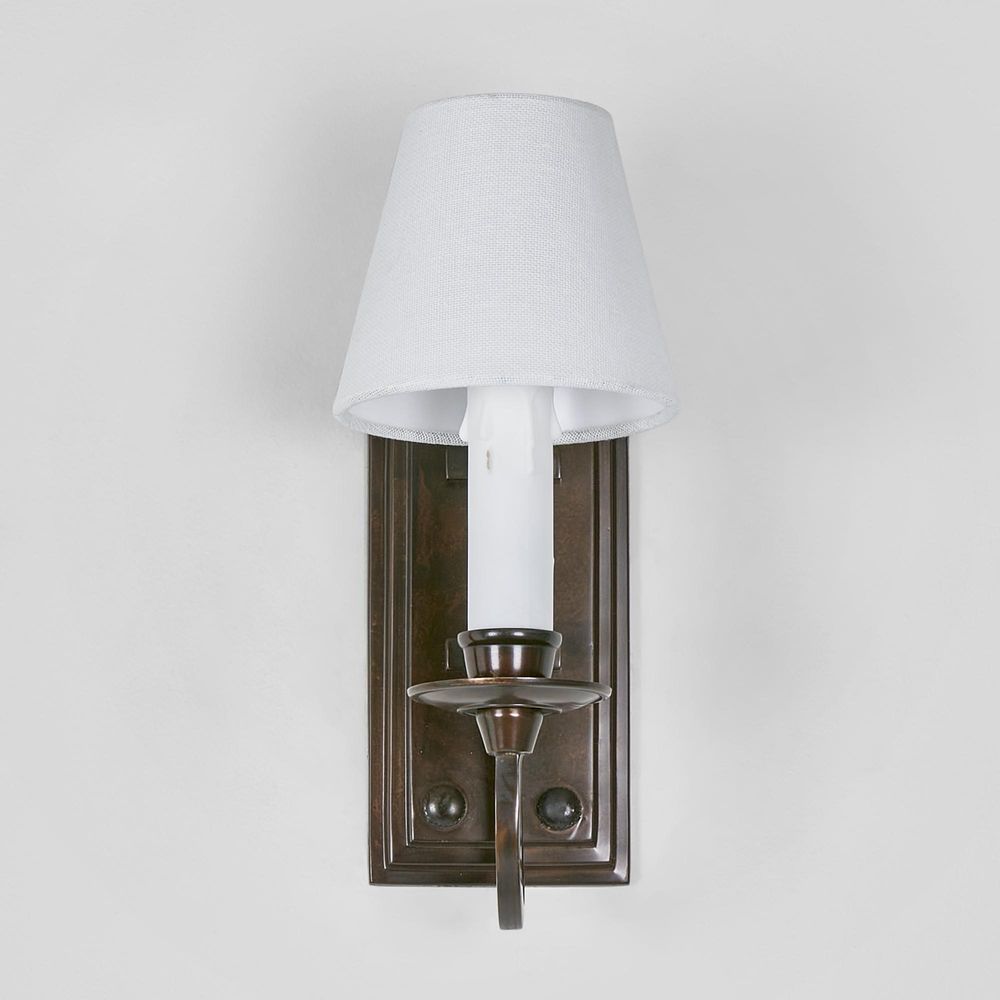 Introducing our East Borne Sconce Base Bronze, a handcrafted industrial wall light made from solid brass with a distressed antique finish. The rectangular backplate, curved arm, and cream candle sleeve create a rich, warm, and authentic aged look that cannot be replicated. This versatile lamp is suitable for both home and business fit-outs and is available in four colors: antique silver, brass, bronze, and shiny nickel. We recommend using a clip fitting shade with a 5-inch diameter on the bottom and a candle-shaped globe for the best results.