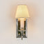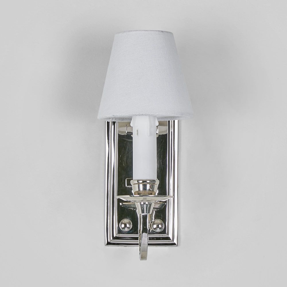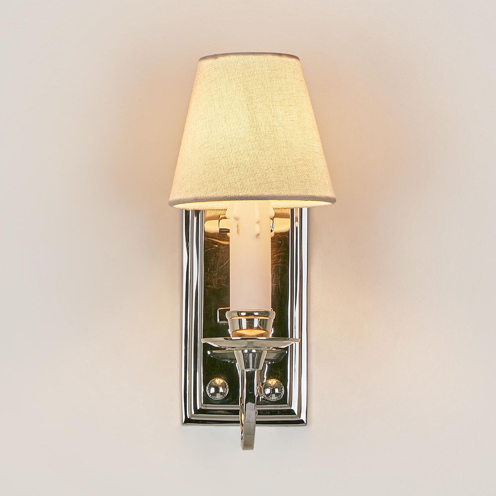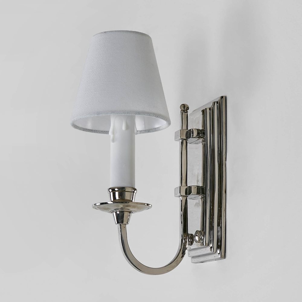 Introducing our East Borne Sconce Base Nickel, a handcrafted industrial wall light made from solid brass with a distressed antique finish. The rectangular backplate, curved arm, and cream candle sleeve create a rich, warm, and authentic aged look that cannot be replicated. This versatile lamp is suitable for both home and business fit-outs and is available in four colors: antique silver, brass, bronze, and shiny nickel. We recommend using a clip fitting shade with a 5-inch diameter on the bottom and a candle-shaped globe for the best results.