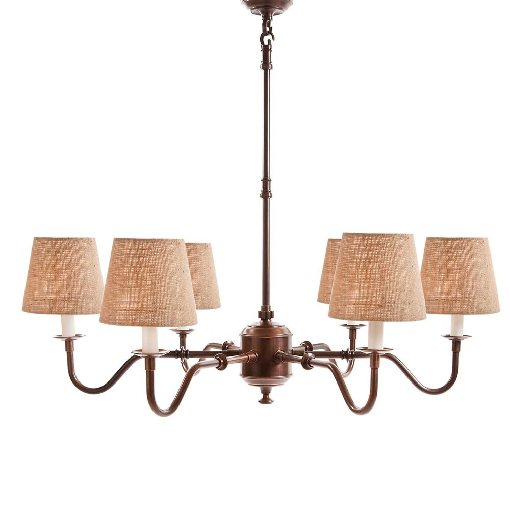 Introducing our Prescot 6 Arm Chandelier Base in Bronze. This traditional lamp is made of solid brass and comes in three antique finishes: brass, silver, and bronze. The light is suspended on three metal rods and can be adjusted for height by removing rods as necessary during installation. We recommend using a 7 or 8 inch shade on the bottom diameter for this chandelier. To view our selection of lamp shades, please click on the links below: