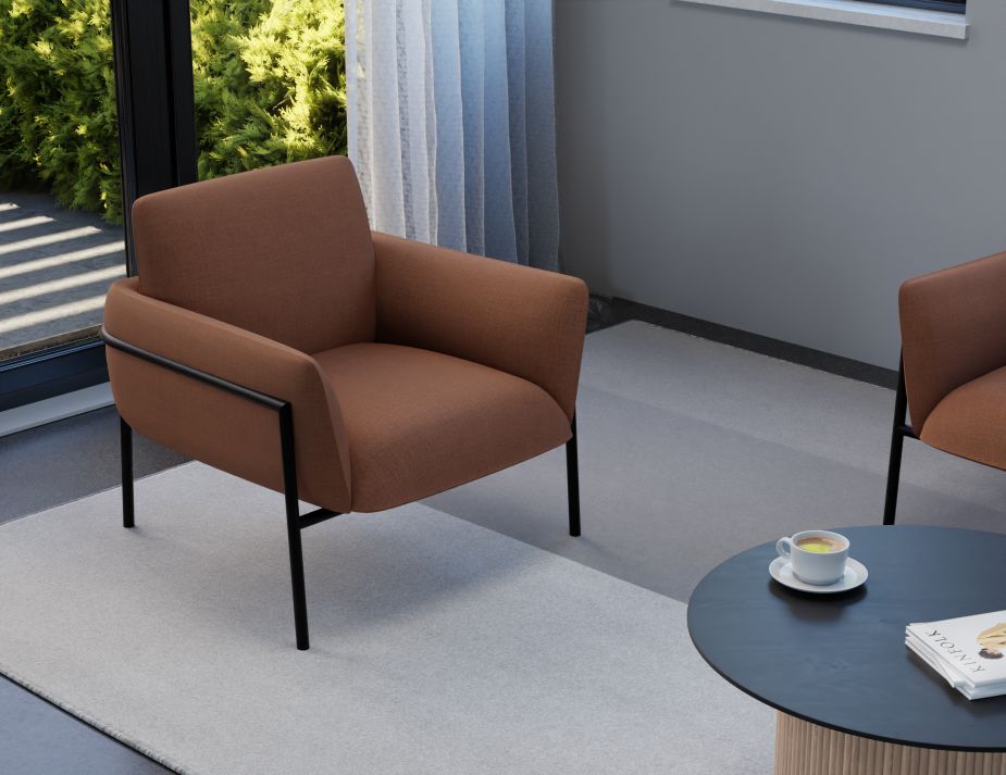 The Charlie Armchair in the sophisticated Terracotta Rust color stands out as an exquisite piece ideally crafted for commercial and hospitality spaces.