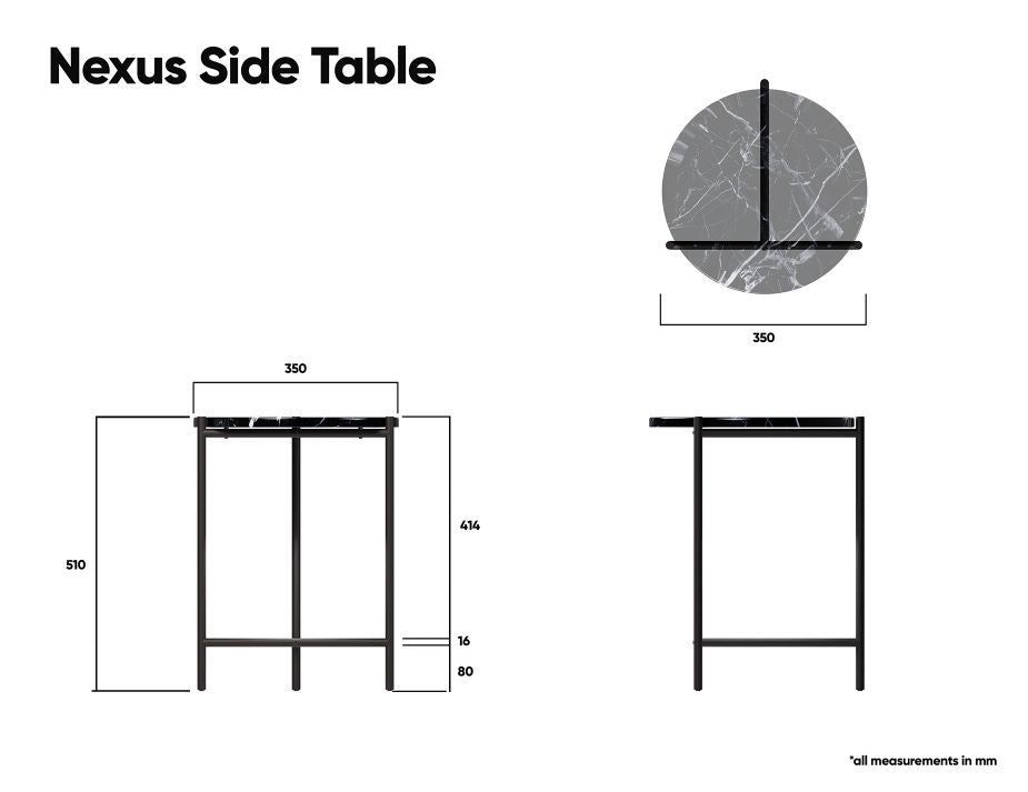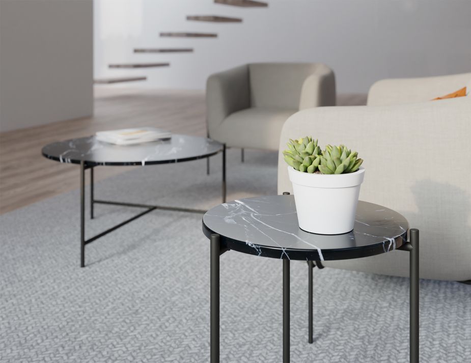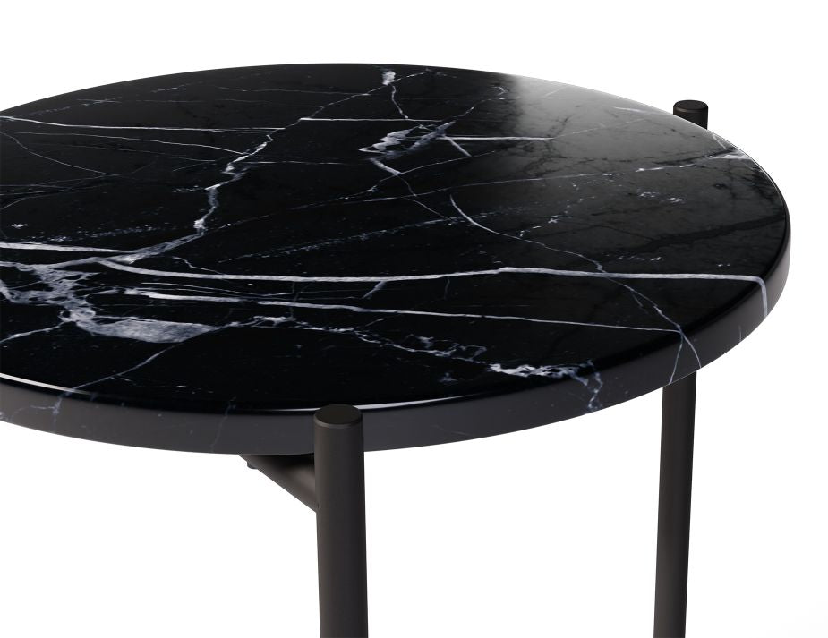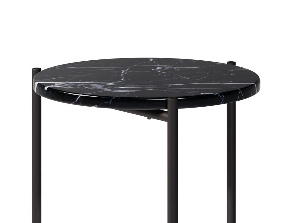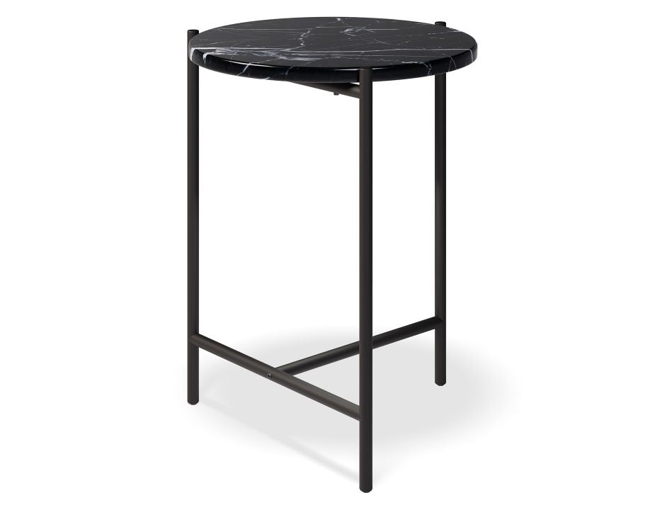 The top is smooth and sleek, showcasing the beauty and natural patterns of the marble. The base of the table is made from matt black powder coated solid steel, adding a modern touch to the overall design. The combination of the natural marble and the matte black steel creates a beautiful contrast that will complement any interior design style. The Nexus Marble Side Table is not just a piece of furniture, but also a work of art. It is the perfect addition for commercial outfitters and commercial furniture suppliers who want to offer their clients unique and high-quality pieces. The table's solid construction and attention to detail make it a durable and long-lasting addition to any space. The table's elegant design will elevate the look of any room, making it a great investment for both commercial and personal use. Whether used as a standalone accent piece or paired with other furniture, the Nexus Marble Side Table is sure to be a conversation starter.