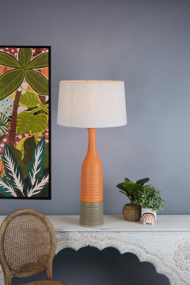 This Potters Large table lamp is the perfect addition to any modern home decor. The tall and thin design, combined with the glazed ceramic material, creates a sleek and sophisticated look. The lamp measures L 51cm x W 51cm x H 106cm, making it a statement piece in any room. The orange and brown color adds a pop of warmth and vibrancy to your space. Elevate your interior design with this luxurious and stylish lamp from House of Isabella, your go-to online shop for home decor and modern furniture in Australia.
